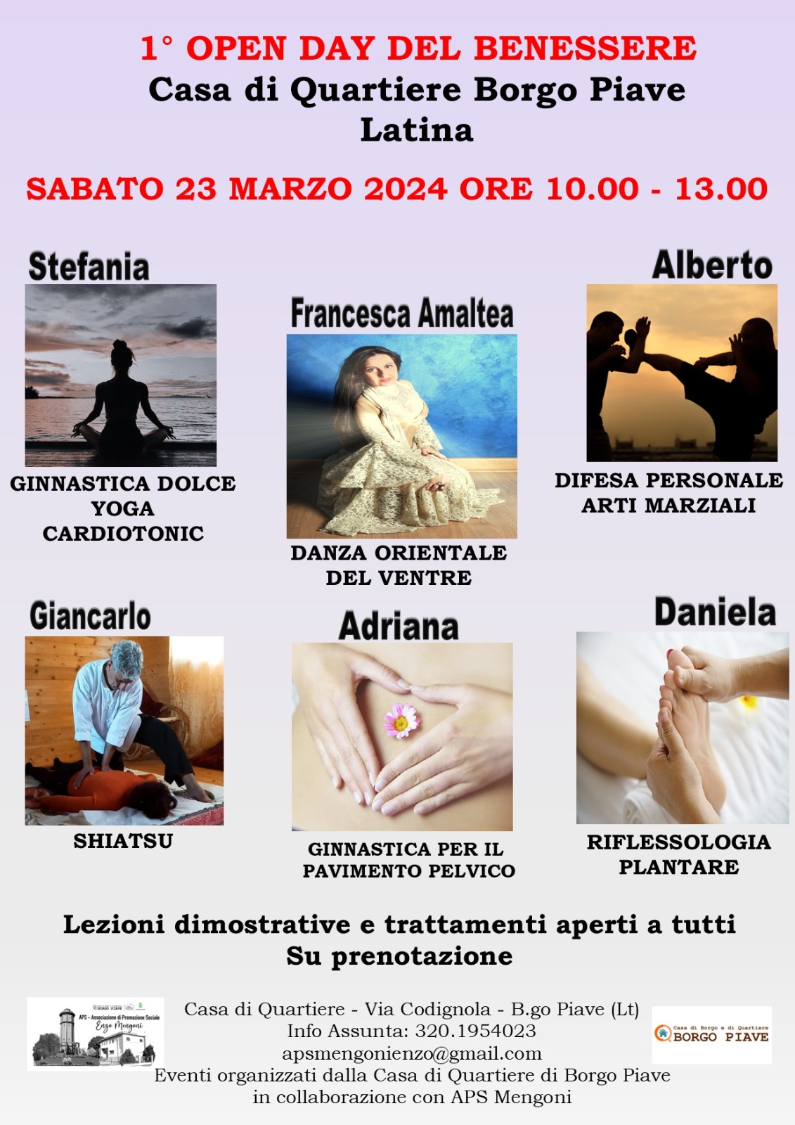 A promuovere l’iniziativa all’Associazione di Promozione Sociale (APS) Mengoni, punto di riferimento per la comunità in tema di prevenzione e salute. Le lezioni dimostrative e i trattamenti sono aperti a tutti, l’open day è gratuito ma è obbligatoria la prenotazione al 320 195 4023. L’appuntamento è Sabato 23 Marzo dalle ore 10:00 alle ore 13:00 alla Casa di Quartiere  in via Codignola a  Borgo Piave (Lt).