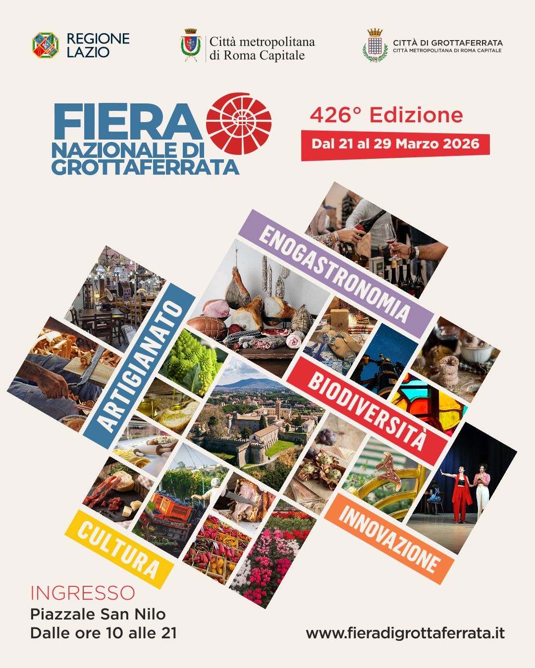 Patrocini: La manifestazione ha ricevuto il patrocinio della Regione Lazio e della Città Metropolitana di Roma Capitale. L’elenco completo degli eventi è sul sito istituzionale del Comune: www.comune.grottaferrata.roma.it Viabilità, parcheggi, tariffe e servizi: www.fieradigrottaferrata.it
