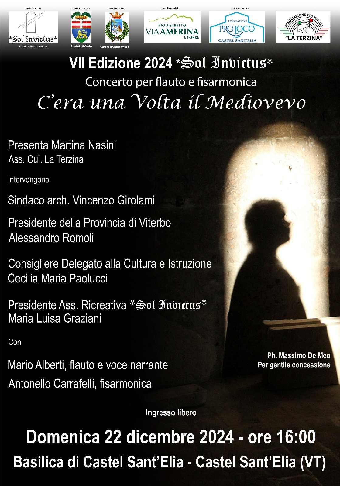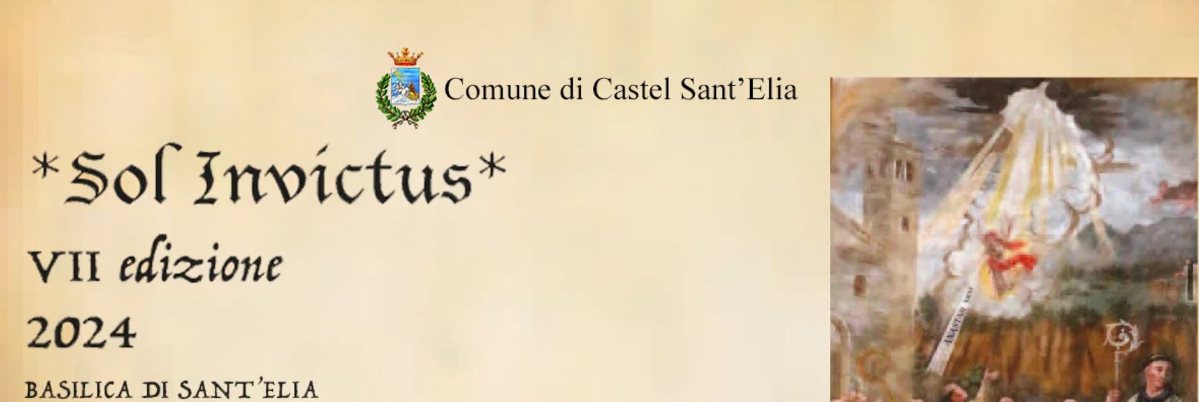 Castel Sant’Elia (Vt) – Presso la Basilica di Sant’Elia nel Comune di Sant’Elia in provincia di Viterbo si terrà la VII edizione della manifestazione “Sol Invictus” le cui iniziative sono state programmate nei giorni di sabato 21 e domenica 22 dicembre 2024 – https://comune.castelsantelia.vt.it/novita/sol-invictus-vii-edizione-2024-il-programma/con la possibilità di assistere al meraviglioso spettacolo dei giochi di luce naturale del Sol Invictus visibili nei giorni del solstizio d’inverno.