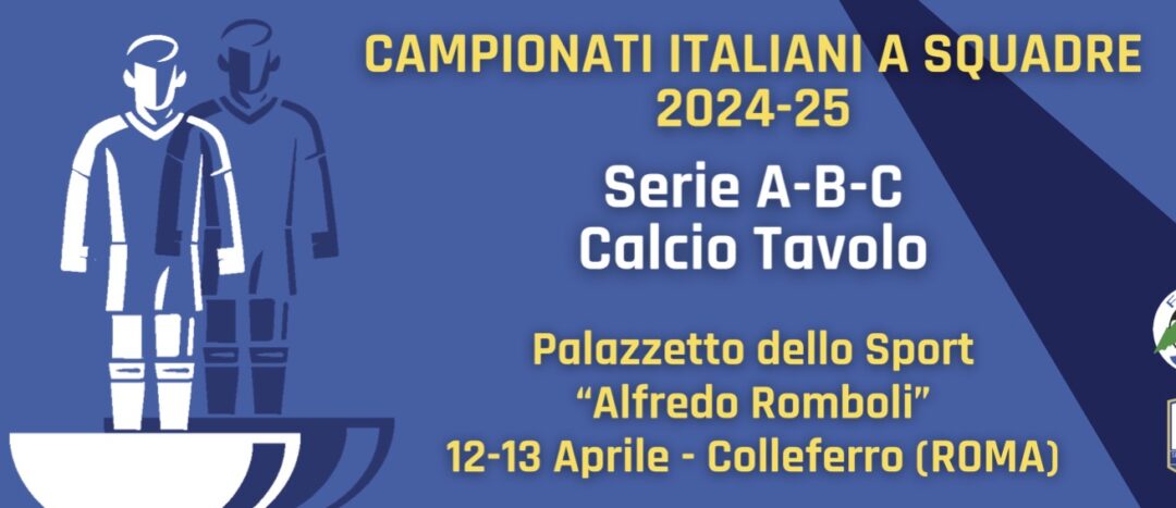 Colleferro (Rm) – Dopo l’emozionante girone di andata disputato lo scorso ottobre, i Campionati Italiani a squadre di Calcio da Tavolo 2024/2025 tornano a Colleferro (Roma) per il girone di ritorno, in programma sabato 12 e domenica 13 aprile presso il Palazzetto dello Sport “Alfredo Romboli”.