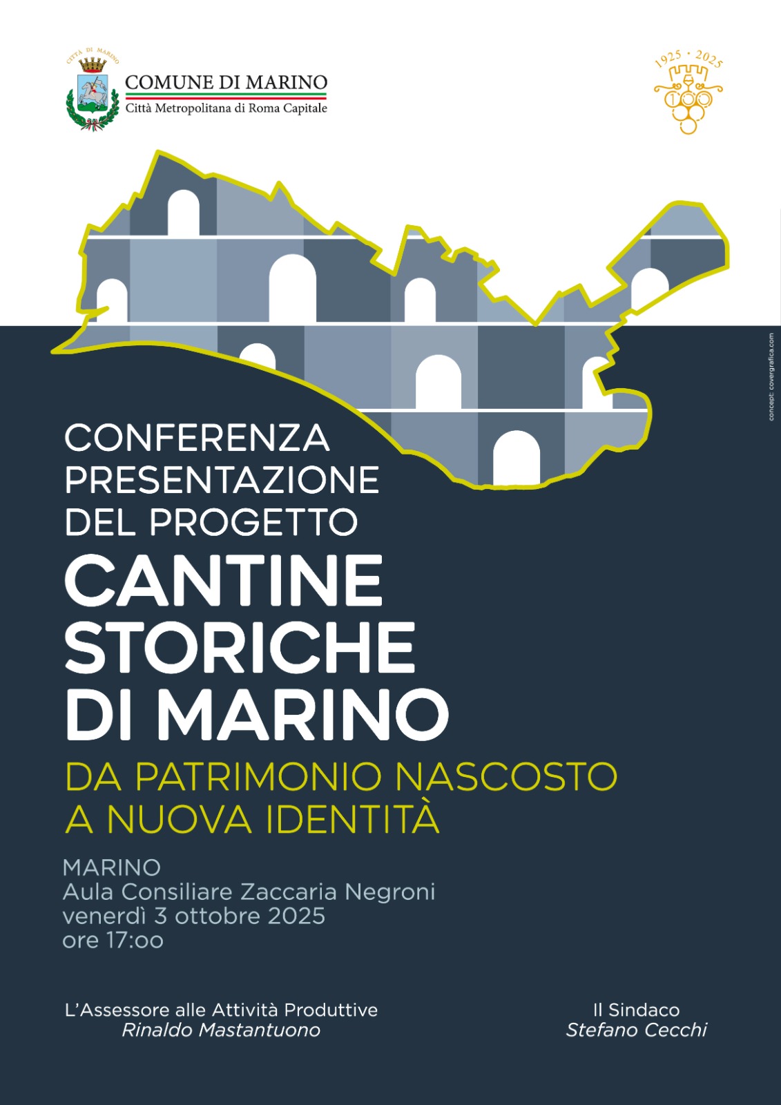 Marino 26 settembre 2025 – Si terrà venerdì 3 ottobre 2025 alle ore 17,00 presso la Sala Consiliare “Z. Negroni” di palazzo Colonna il Convegno di Presentazione del Progetto Cantine Storiche in occasione del Centenario della Sagra dell’Uva di Marino.