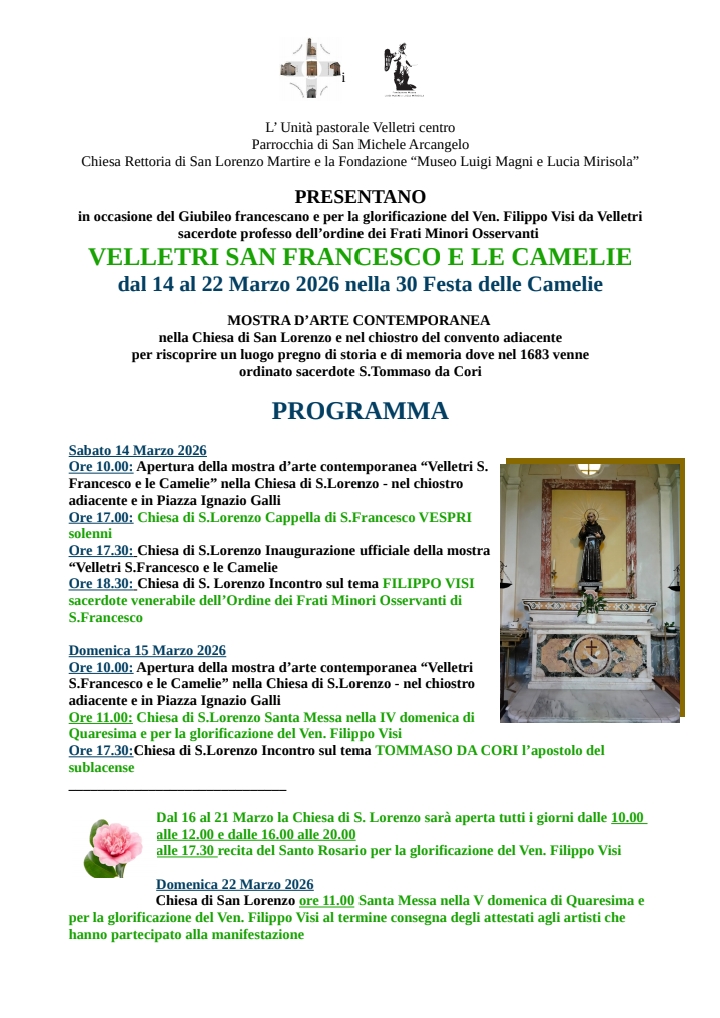 Velletri 1 marzo 2026 – Grazie al sostegno e alla collaborazione di Mons. Roberto Mariani parroco di S. Michele Arcangelo e sei suoi collaboratori operanti nella Chiesa eretta sul punto più alto di Velletri dal 14 al 22 Marzo – mostra d’arte contemporanea – momenti di preghiera – incontri per riscoprire le figure del Ven. Filippo Visi e di S. Tommaso da Cori che vi fu ordinato sacerdote nel 1633.