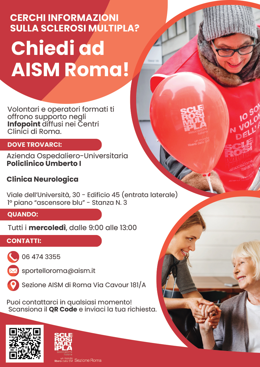 L’iniziativa, promossa dall’Associazione Italiana Sclerosi Multipla (AISM) – Sezione Provinciale di Roma, si avvale dell’impegno dei volontari dell’Associazione e nasce con l’obiettivo di fornire informazioni utili, orientamento ai servizi e supporto personalizzato, integrando l’attività clinica del Centro Sclerosi Multipla del Policlinico.