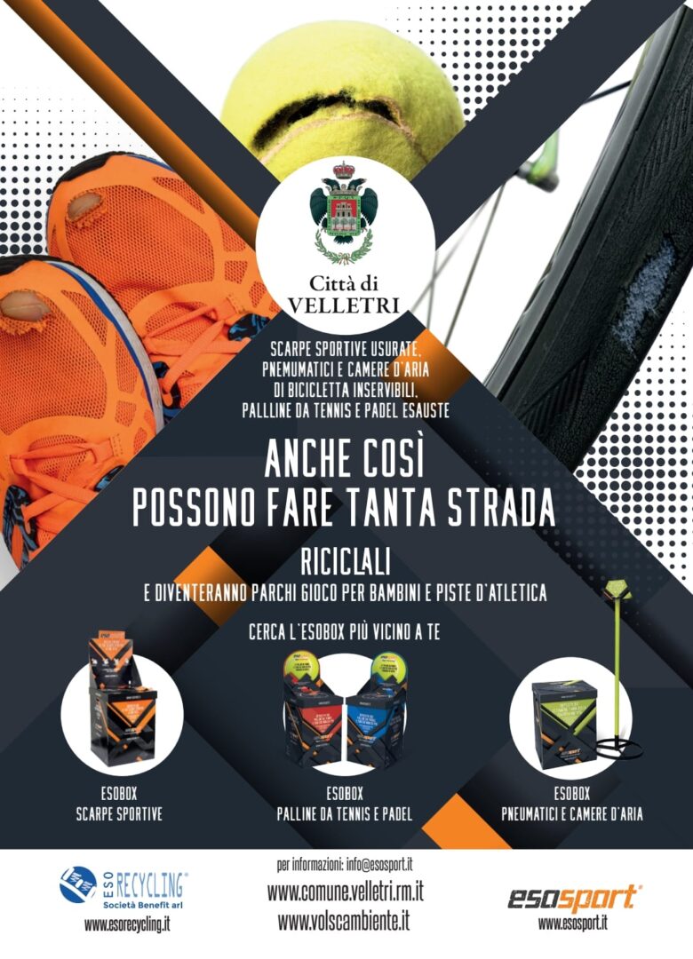 Velletri (Rm) – È stato attivato un sistema di raccolta di materiali sportivi esausti, tra cui palline da tennis e padel, scarpe sportive usurate, pneumatici e camere d’aria di biciclette non più utilizzabili che verranno riciclati e trasformati in pavimentazioni per parchi gioco e piste d’atletica.