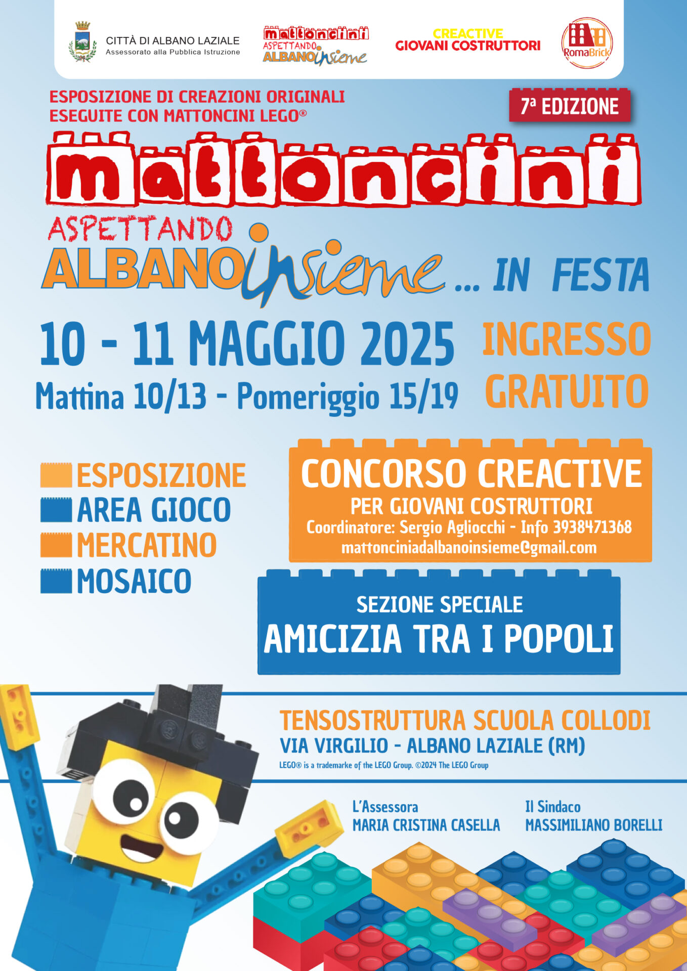- Aspettando l’XI Edizione di “Albano InSieme…in festa!” – prevista per domenica 8 giugno 2025 – torna ad Albano Laziale il “Festival dei Mattoncini!” – promosso dall’assessorato alla Pubblica Istruzione e giunto alla sua VII Edizione