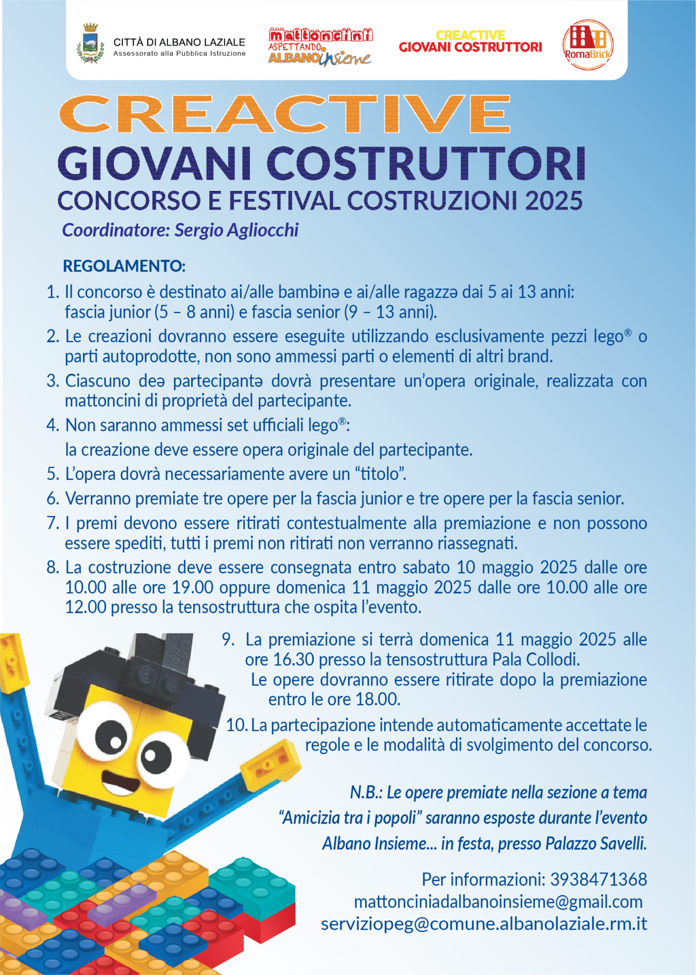Il “Festival Mattoncini – Aspettando Albano InSieme…in festa!” prevede, anche quest’anno, il Concorso “Creative – Giovani Costruttori” destinato alle bambine e ai bambini e ai ragazzi e alle ragazze dai 5 ai 13 anni e a cui si potrà partecipare presentando un’opera originale realizzata con mattoncini lego.