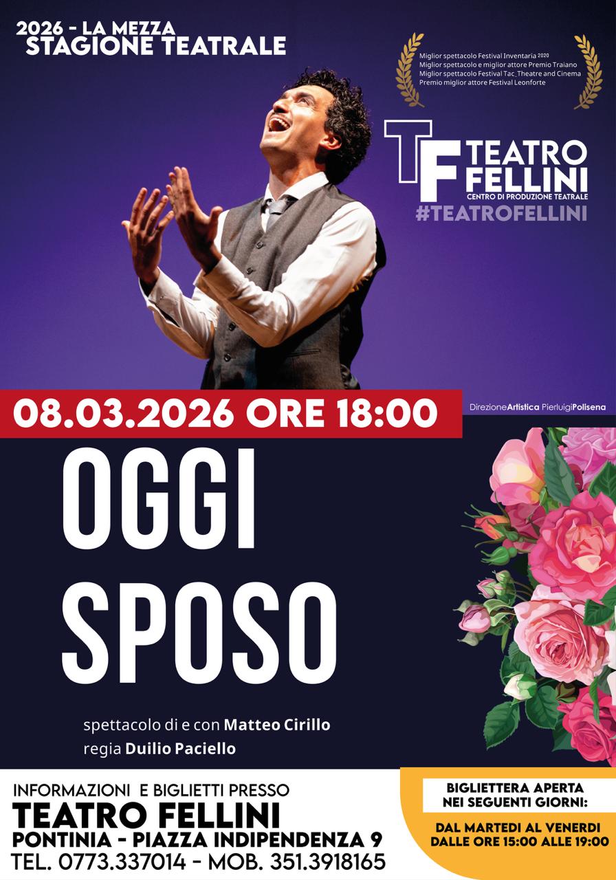 Latina 4 marzo 2026 – Torna ad alzarsi il sipario del Teatro Fellini di Pontinia domenica 8 marzo alle ore 18.00 con il secondo appuntamento in cartellone della nuova stagione.