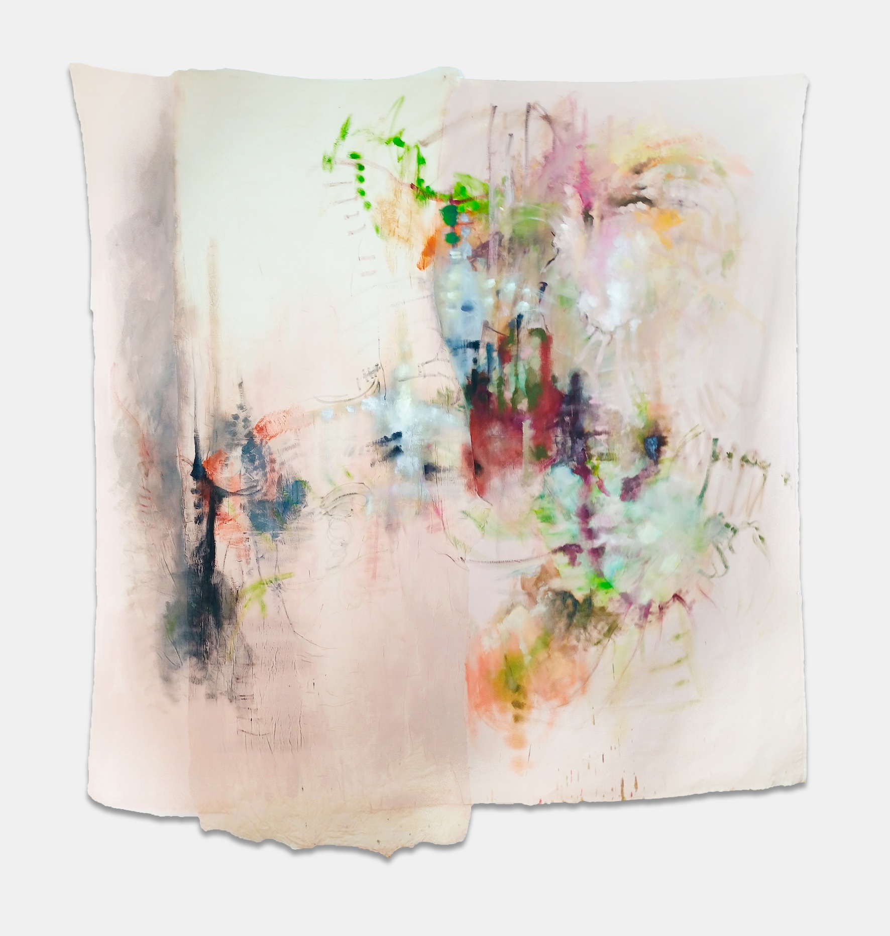 Questi agitati fraseggi, che appaiono a volte ventosi nell’emersione dei fondi più chiari e a volte marezzati da un sapiente uso di cromie sia concilianti sia dissonanti, sono affidati spesso a tessuti e teli che non hanno bisogno di essere rinchiusi nell’armatura di un telaio, ma che vengono lasciati liberi di cadere lungo i muri o di impossessarsi degli ambienti di Casa Vuota, facendosi soglie, sipari e membrane da toccare e attraversare».