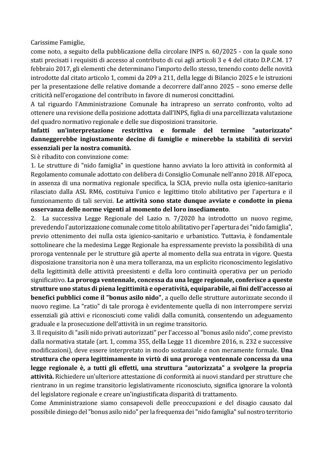 L’Amministrazione contesta l’interpretazione restrittiva dell’INPS, che esclude ingiustamente queste realtà dal contributo. È in corso un confronto serrato con l’INPS per garantire il riconoscimento dei diritti delle famiglie.