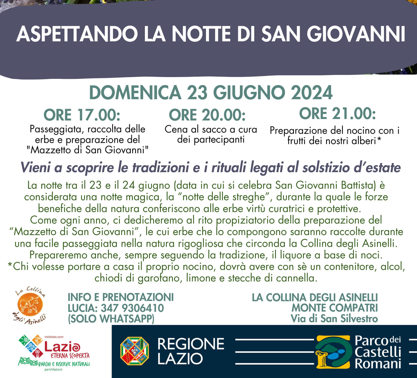 Alle ore 17.00, si svolgerà la passeggiata con la raccolta delle erbe e la preparazione del ‘Mazzetto di San Giovanni‘; alle ore 20.00 cena al sacco a cura dei partecipanti; alle ore 21.00 preparazione del nocino con i frutti dei nostri alberi. Ci volesse portare a casa il proprio nocino, deve munirsi di un contenitore, alcol, chiodi di garofano, limone e stecche di cannella. Nella locandina, la descrizione dettagliata dell’evento.