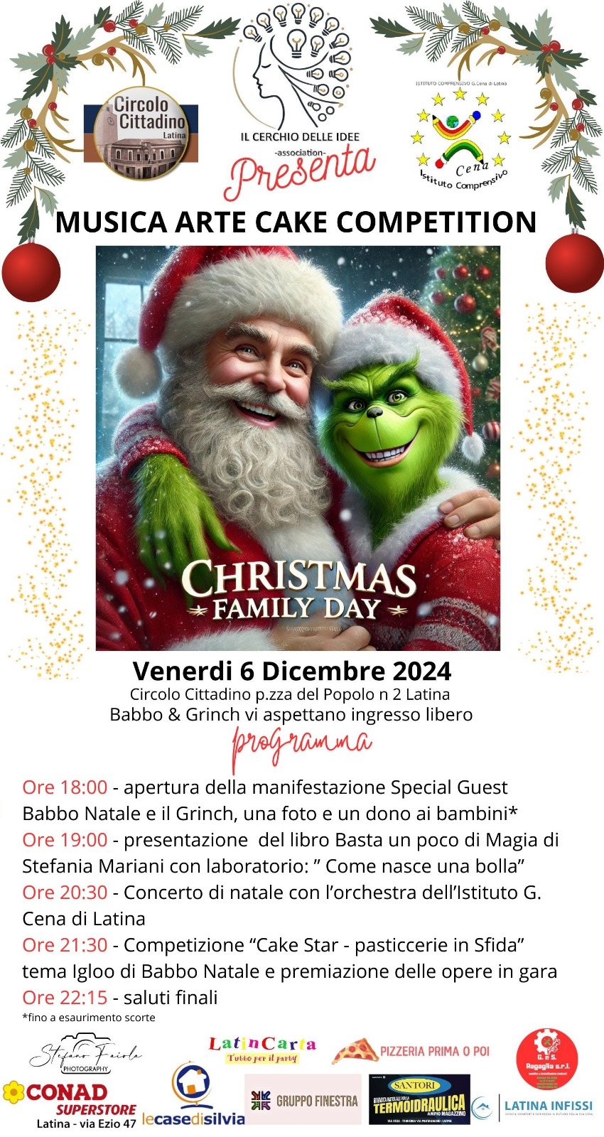 Babbo Natale, Grinch ed Elfi, numeri di magia per bambini, Concerto di Natale e Pasticcerie in Sfida venerdì 6 dicembre Circolo Cittadino “Sante Palumbo” Latina – Piazza del Popolo. Ingresso Libero
