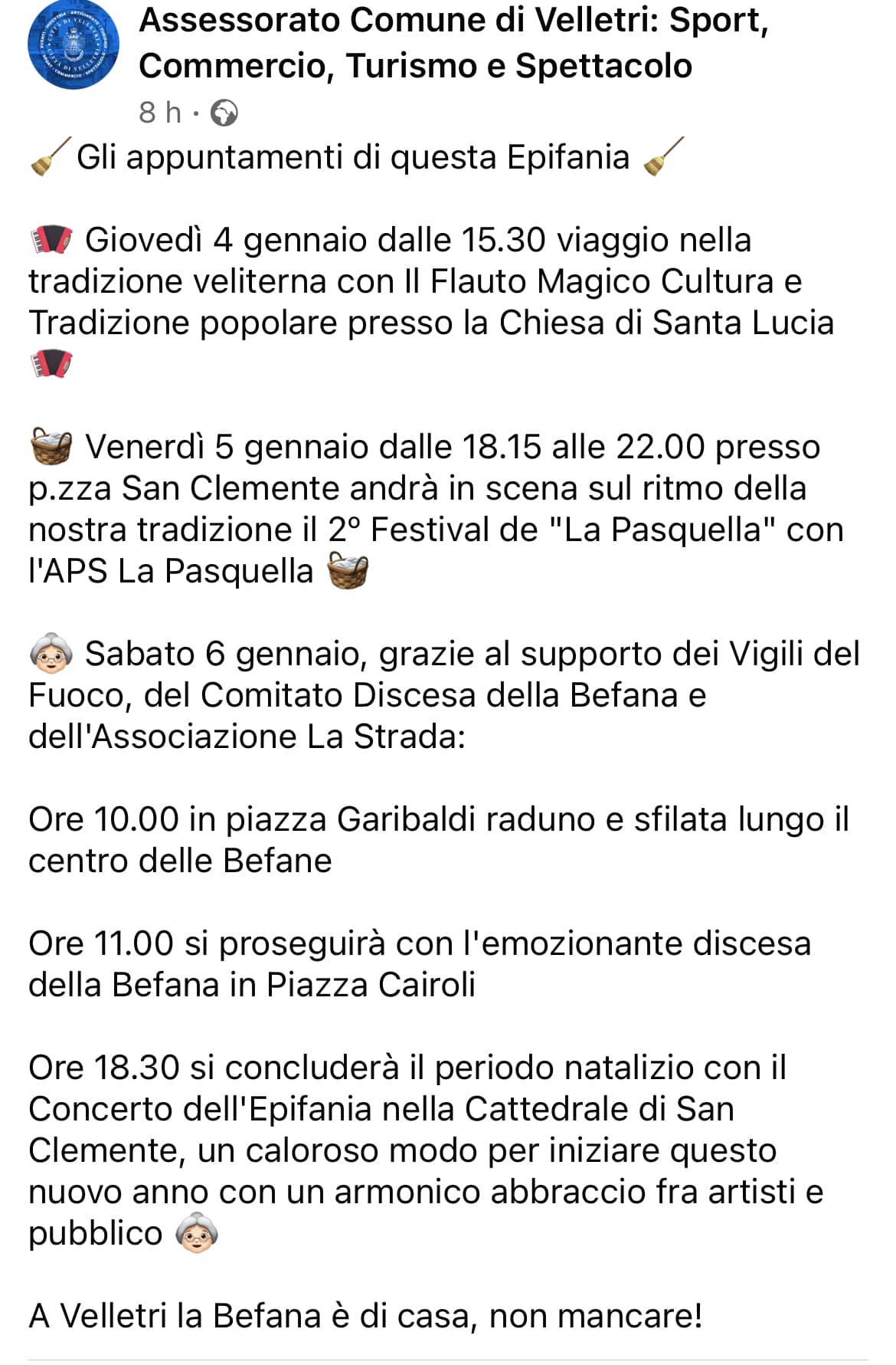 L’assessorato allo Sport, Commercio, Turismo e Spettacolo di Velletri chiude il ciclo delle festività natalizie e di inizio anno organizzando vari appuntamenti che rispecchiano l’amore dei velletrani per la cara ‘vecchietta’