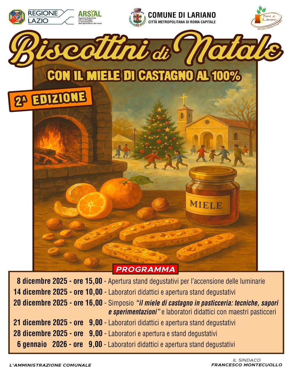 Lariano 12 dicembre 2025 – Valorizzare una tradizione che profuma di bosco, famiglia e storia locale. Con questo spirito l’Assessore all’Agricoltura e alla Sovranità Alimentare, Sabrina Verri, ha presentato il nuovo progetto del Comune di Lariano dedicato a uno dei simboli gastronomici più riconoscibili del periodo natalizio: i biscottini di Natale al miele di castagno, un prodotto che affonda le sue radici nelle antiche usanze del territorio.
