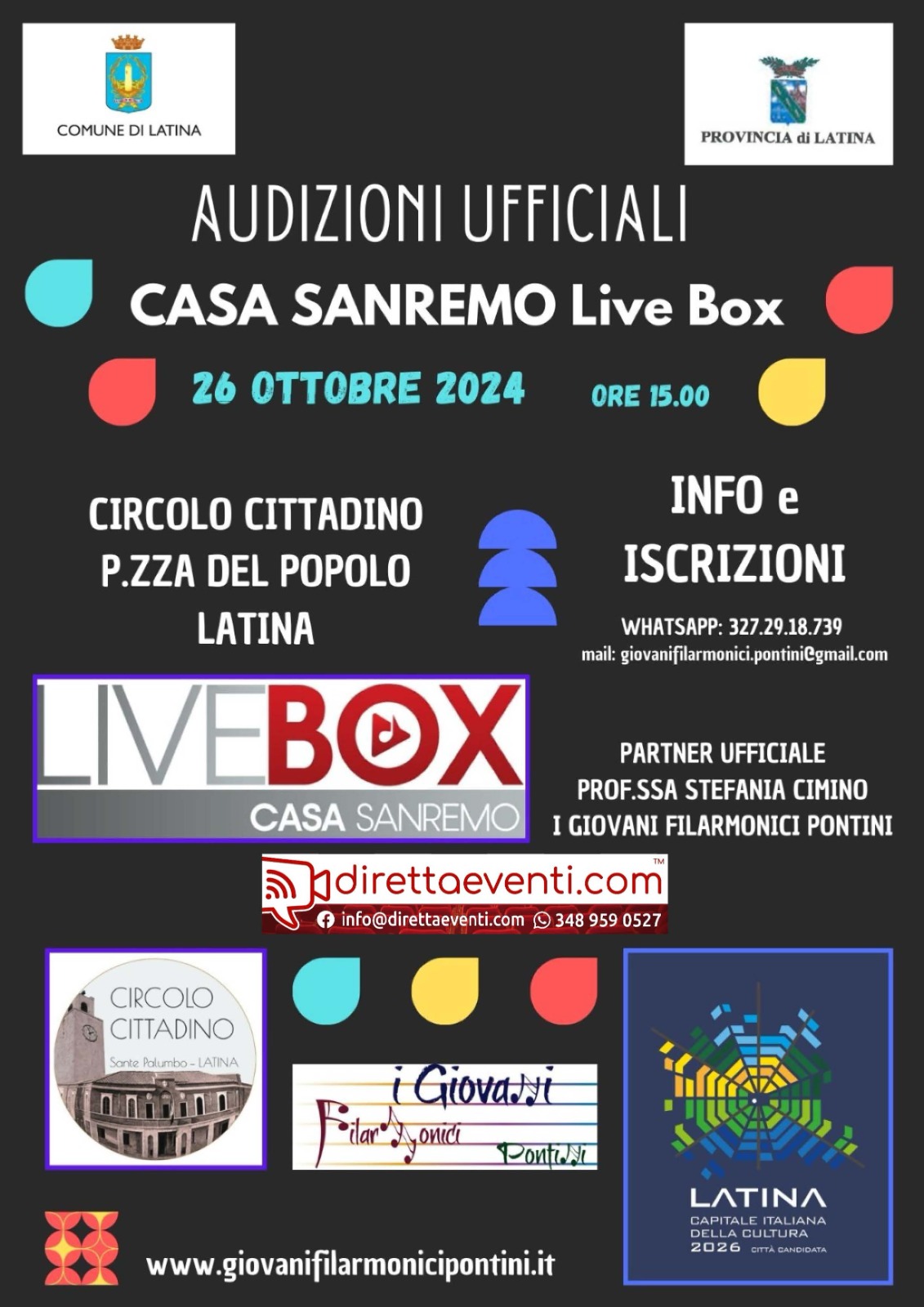 Latina (Lt) – Eletti partner ufficiali di Casa Sanremo LiveBox 2025 i Giovani Filarmonici Pontini selezionano i Talenti provenienti dalla penisola da portare a Casa Sanremo dove, al Palafiori, si esibiranno nella settimana del Festival della Canzone Italiana. Con il Direttore Artistico di Casa Sanremo LiveBox il M° Ciro Barbato e l’Ufficio Stampa di Casa Sanremo Livebox sono pronti a selezionare artisti, musicisti, cantanti, cantautori, band e formazioni fino ad 8 elementi. Il team di professionisti e gli artisti che lavorano al progetto, proporranno in terra pontina due momenti di alta formazione con altrettante Master Classes che potranno essere seguite anche in Streaming grazie a Diretta Eventi di Stefano Ingravalle, sabato 26 ottobre dalle ore 10:00.