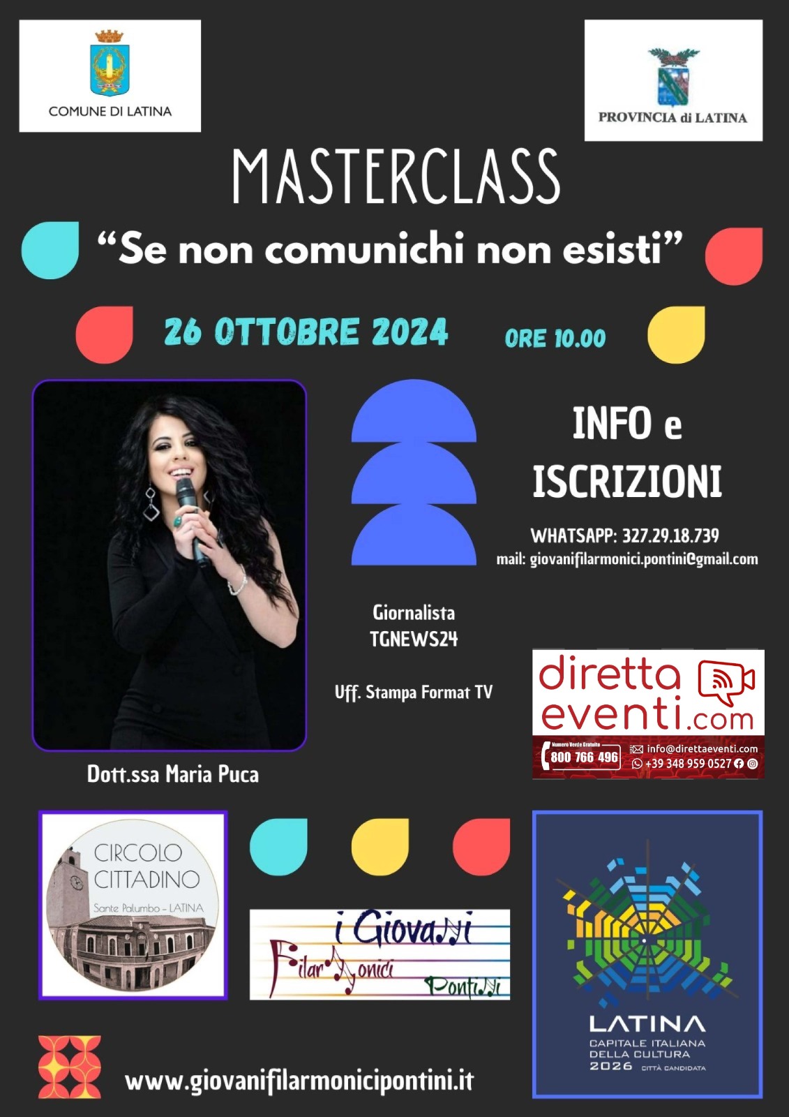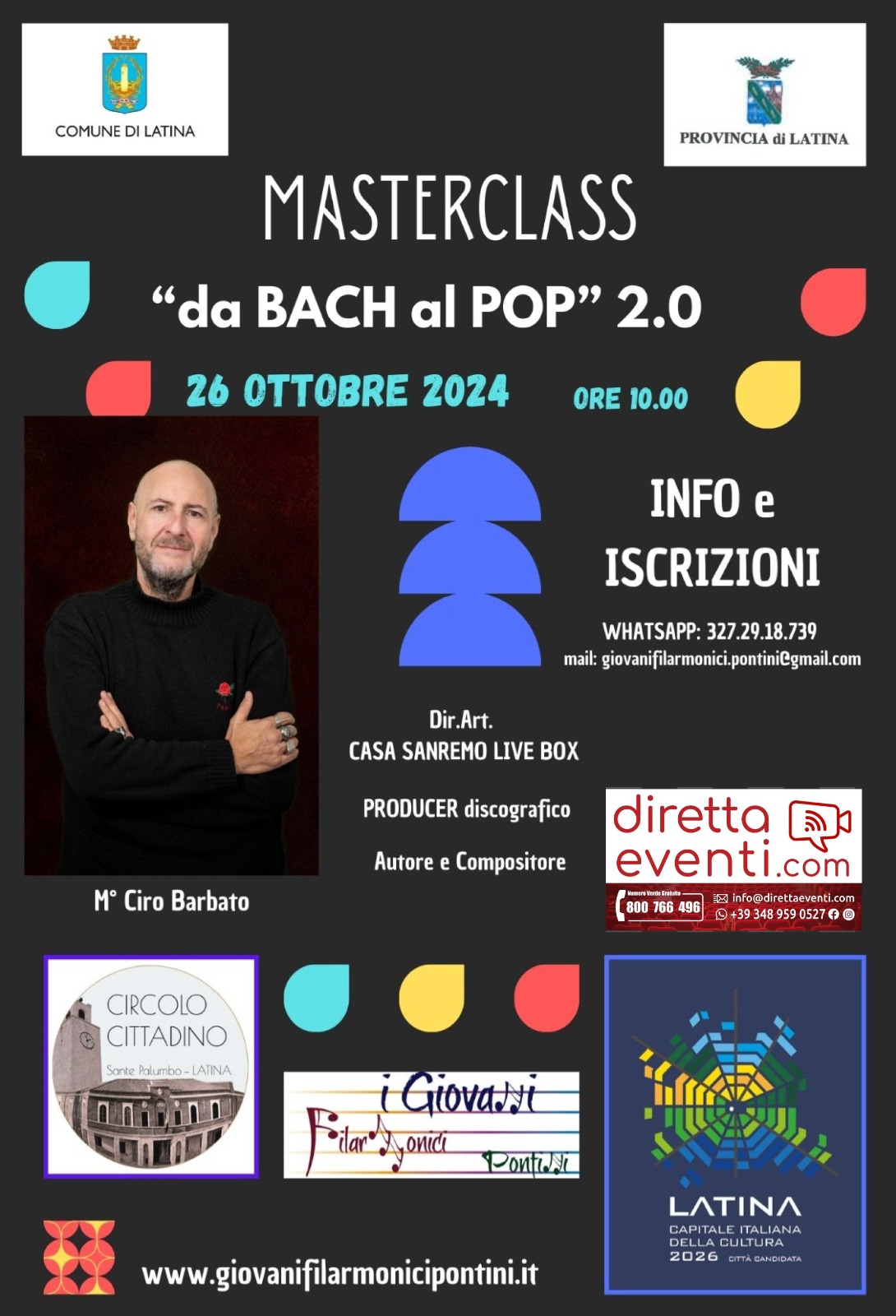 Sabato 26 ottobre dalle ore 10:00 sala Auditorium Circolo Cittadino “Sante Palumbo” in Piazza del Popolo a Latina. Due Masterclasses: con il M° Ciro Barbato e la giornalista Maria Puca, a seguire selezioni per Casa Sanremo LiveBox