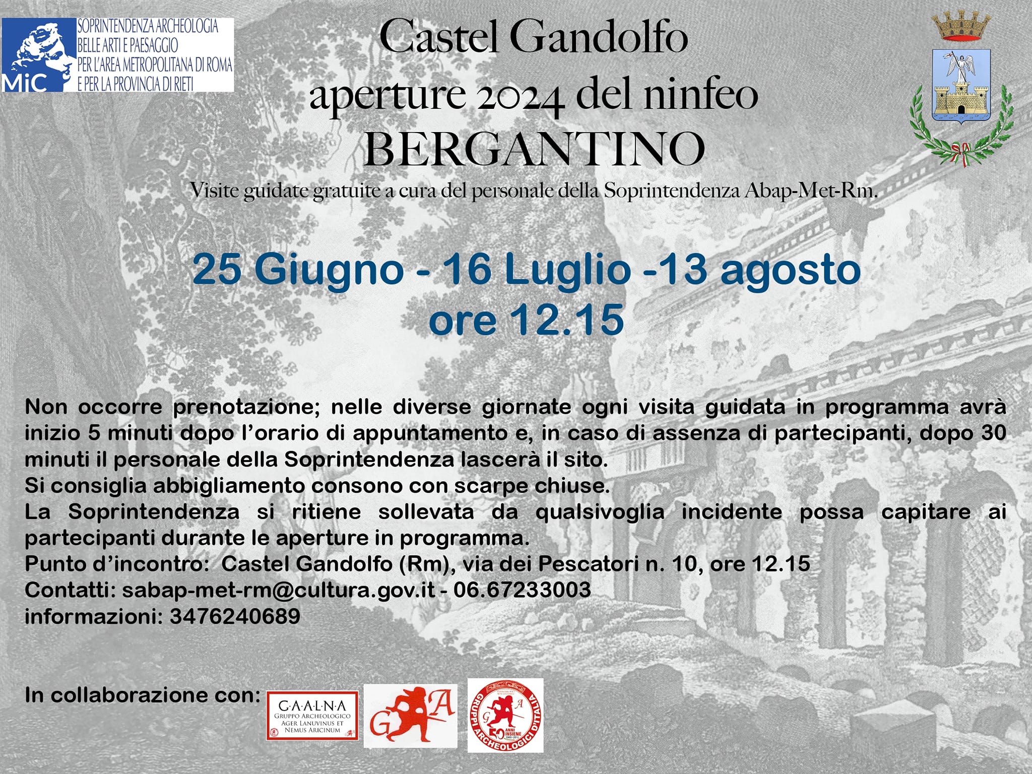 Castel Gandolfo (Rm) – La Soprintendenza ABAP per l’area metropolitana di Roma e la provincia di Rieti presenta tre appuntamenti (25 giugno -16 luglio – 13 agosto) in cui sarà possibile visitare il ninfeo del Bergantino di Castel Gandolfo.