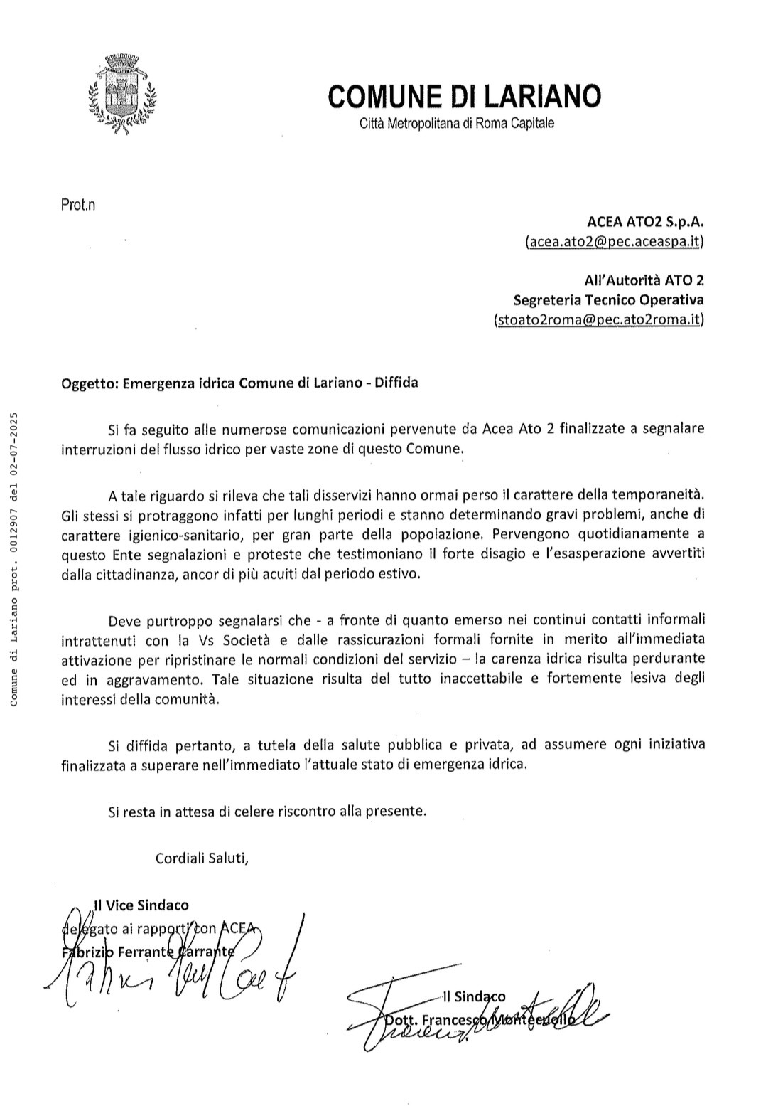 “Nonostante le rassicurazioni che ci erano state fornite, il perdurare della grave carenza idrica che sta interessando diverse zone del nostro territorio mi ha spinto a inviare, in data odierna, una formale lettera di diffida alla società Acea Ato 2, responsabile del servizio idrico.