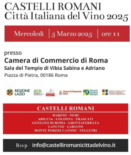 Roma (Rm) – I Castelli Romani sono stati designati Città Italiana del Vino 2025 dall’Associazione Nazionale Città del Vino. L’annuncio è stato dato oggi (merc 5 marzo 25) a Roma, presso la Camera di Commercio, nella prestigiosa Sala del Tempio di Vibia Sabina ed Adriano.
