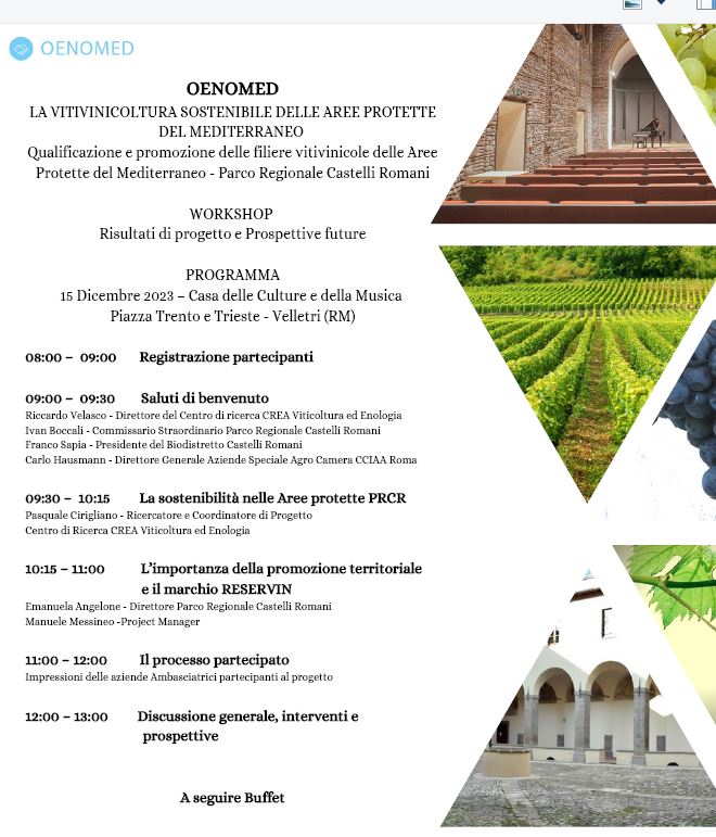 Velletri (Rm) – Il progetto Oenomed (finalizzato alla “Qualificazione e Promozione delle filiere vitivinicole delle Aree Protette del Mediterraneo”) – ne abbiamo parlato ad ottobre – è un progetto di cooperazione transfrontaliera finanziato dall’Unione Europea nell’ambito del programma ENI CBC MED che riunisce 4 paesi del Mediterraneo (Tunisia, Francia, Italia e Libano) e 12 partner.
