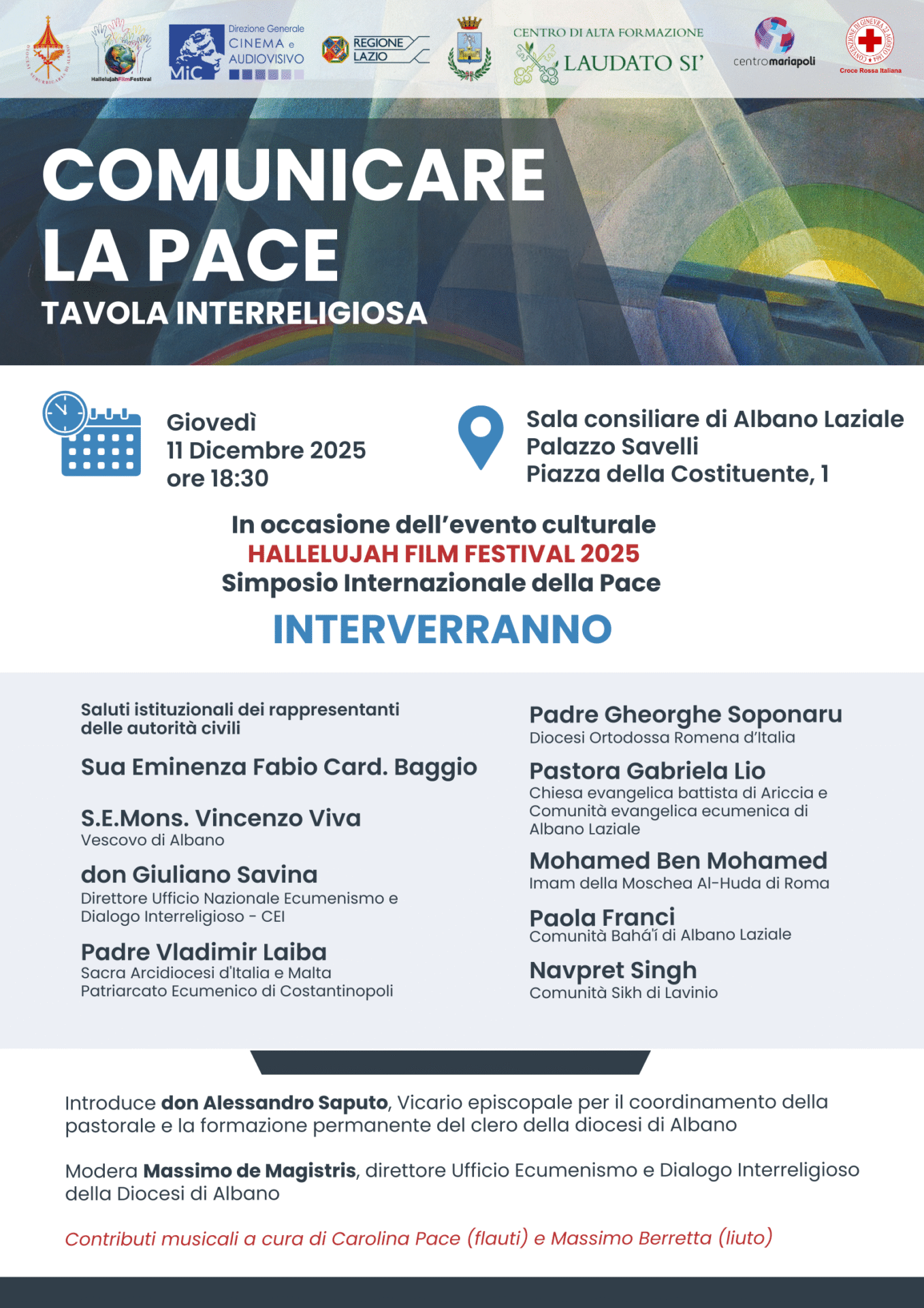 Albano 1 dicembre 2025 – ll prossimo 11 dicembre, alle ore 18:30, presso la Sala consiliare del comune di Albano in piazza della Costituente 1, si terrà la tavola interreligiosa “COMUNICARE LA PACE”.