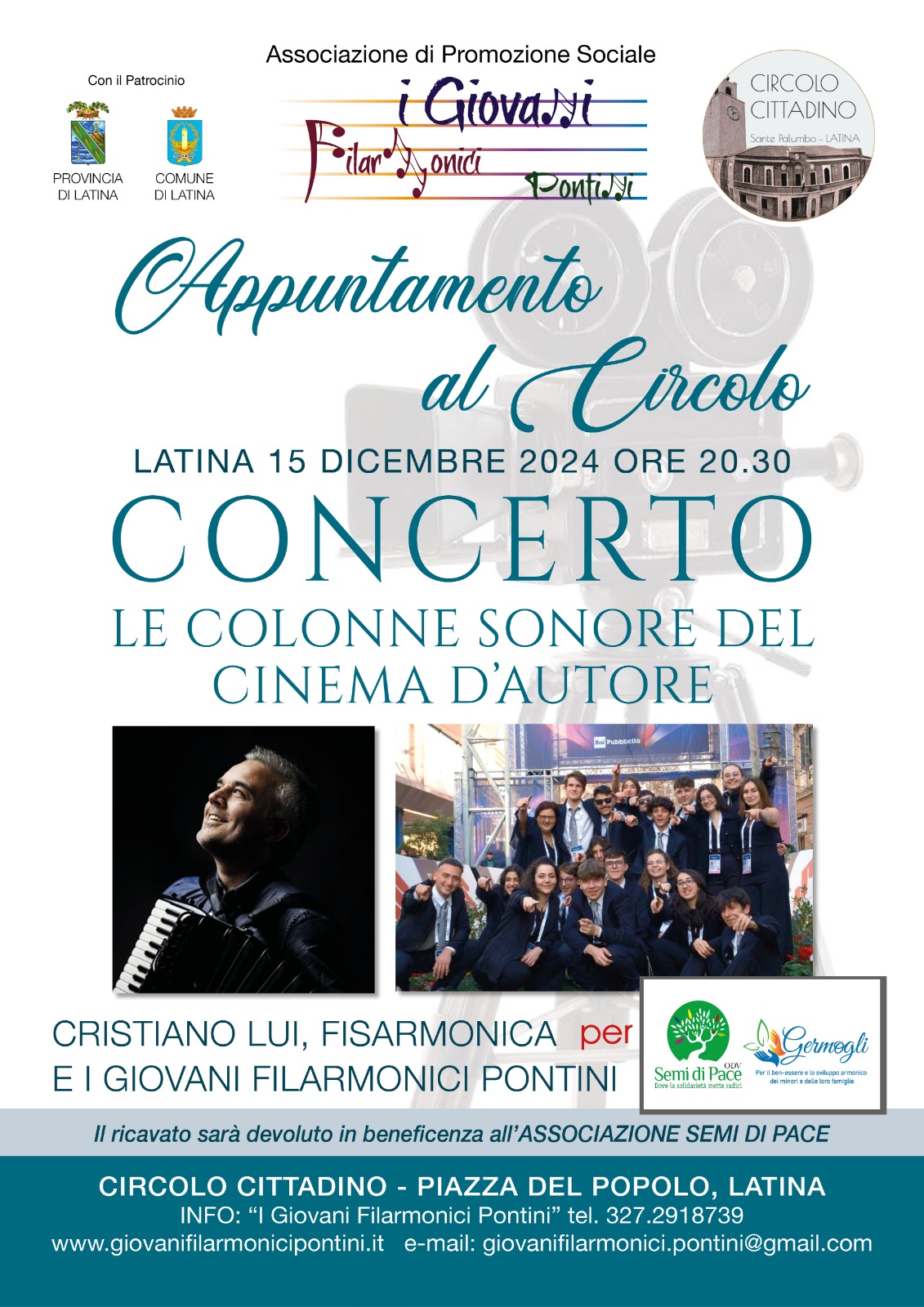 Domenica 15 Dicembre ore 20.30 al Circolo Cittadino Sante Palumbo di Latina in piazza del Popolo. Giovani Filarmonici Pontini e Cristiano Lui in “Appuntamento al Circolo” per l’Associazione Semi di Pace