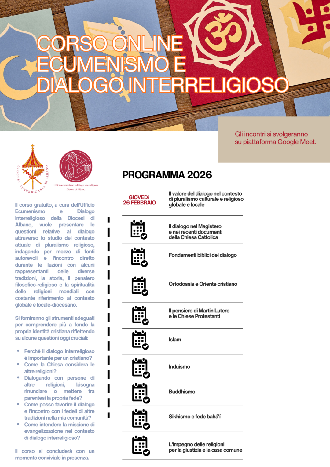 - L’Ufficio Ecumenismo e Dialogo Interreligioso della Diocesi di Albano, propone un corso online gratuito in 10 incontri