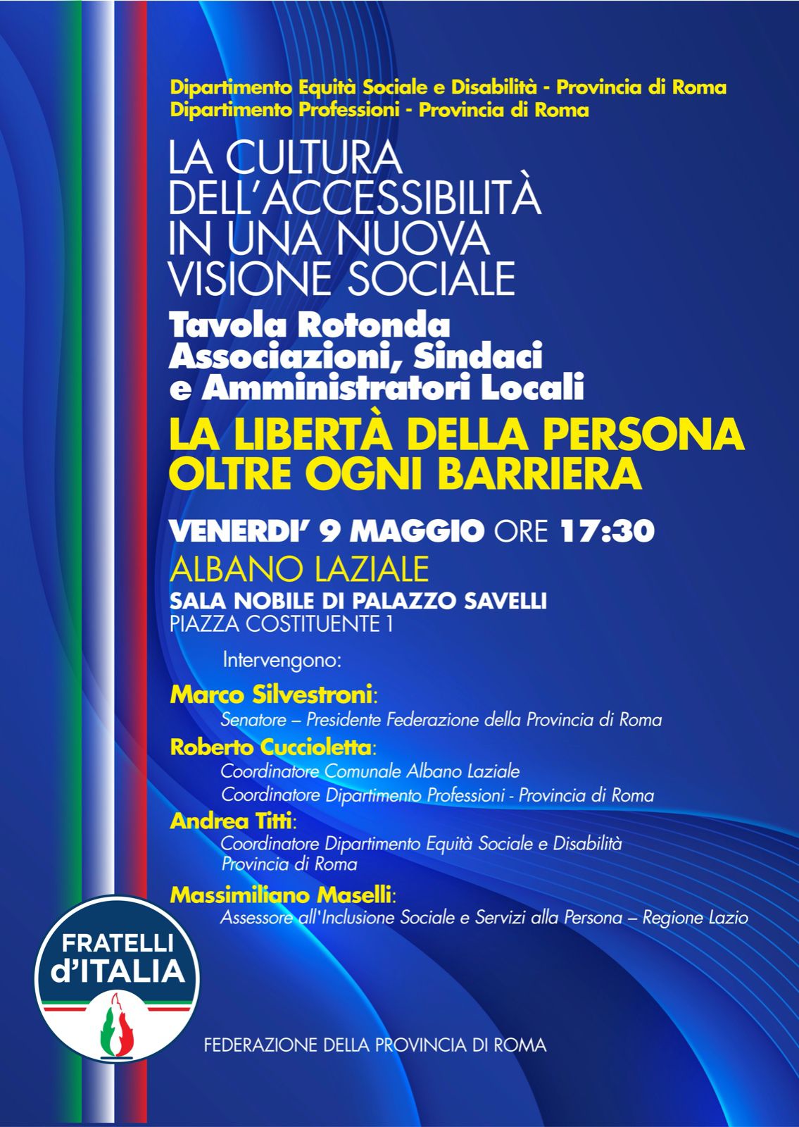 Albano (Rm) – Il prossimo venerdì 9 maggio ad Albano Laziale, presso la Sala Nobile di Palazzo Savelli, dalle ore 17:30, i dipartimenti Professionisti, Equità Sociale e Disabilità, della Federazione della Provincia di Roma di Fratelli d’Italia promuovono un convegno sui temi dell’accessibilità e dell’inclusione dal titolo: “La cultura dell’accessibilità in una nuova visione sociale”, all’interno del quale si terrà una tavola rotonda tra sindaci, amministratori locali e associazioni del terzo settore.
