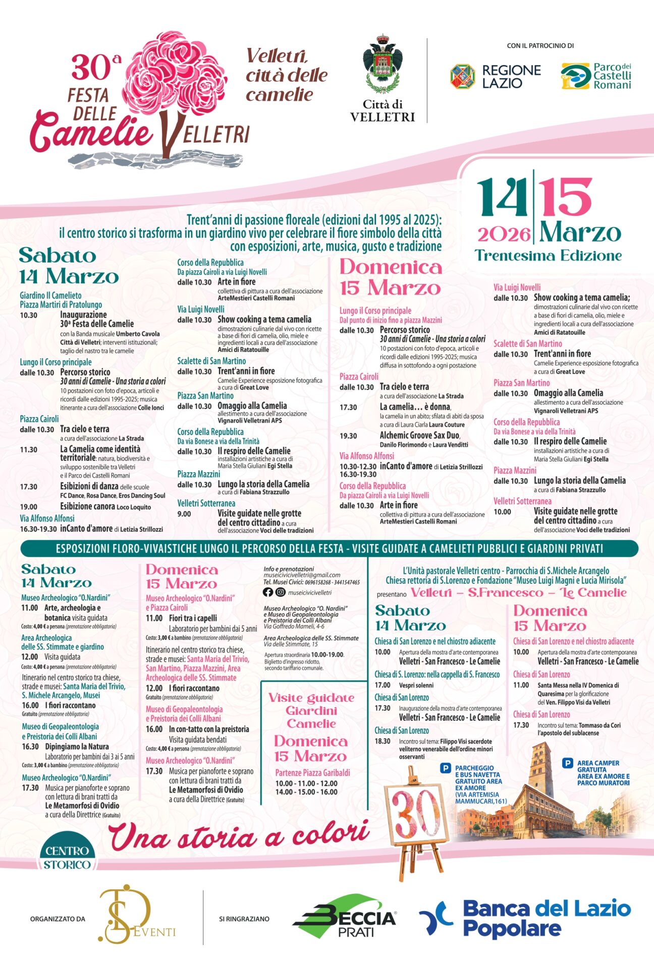 Velletri 11 marzo 2026 – A Velletri, sabato 14 e domenica 15 marzo, si svolge la trentesima Festa delle Camelie. La manifestazione è organizzata dal Comune di Velletri – con il patrocinio di Regione Lazio e Parco dei Castelli Romani – che ha incaricato, per il terzo anno consecutivo, l’assessore Paolo Felci (Turismo e Spettacolo) e il vicesindaco Chiara Ercoli (Cultura), ad occuparsi dell’organizzazione. A loro supporto la società DEven di Velletri.