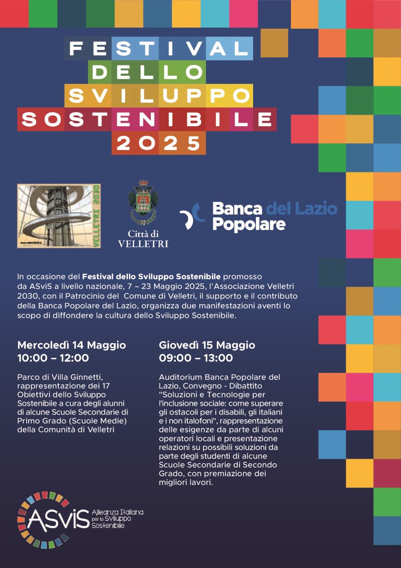 Velletri (Rm) – In occasione del Festival dello Sviluppo Sostenibile promosso da ASviS a livello nazionale, 7 – 23 Maggio 2025, l’Associazione Velletri 2030, con il Patrocinio del Comune di Velletri, il supporto e il contributo della Banca Popolare del Lazio, organizza due manifestazioni aventi lo scopo di diffondere la cultura dello Sviluppo Sostenibile.