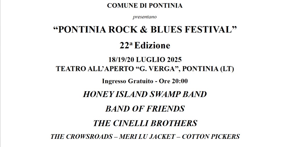 - Domani sera, venerdì 18 luglio alle ore 20, finalmente riapriranno i cancelli dell’Arena “G. Verga” di Pontinia, pronta ad accogliere la XXII edizione del Rock & Blues Festival: appuntamento estivo da non perdere per la speciale atmosfera che sarà offerta agli spettatori