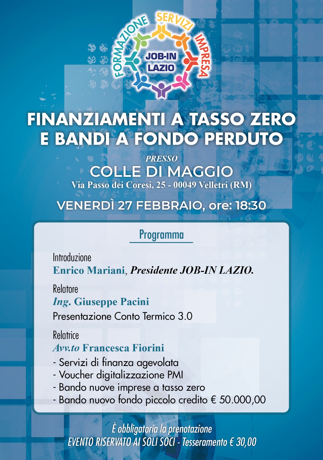 Si terrà giovedì 27 febbraio 2026, alle ore 18.30, presso Colle di Maggio  a Velletri (Via Passo dei Coresi, 25), l’evento formativo promosso dall’Associazione Job in Lazio, rivolto a imprenditori, commercianti e professionisti del territorio.