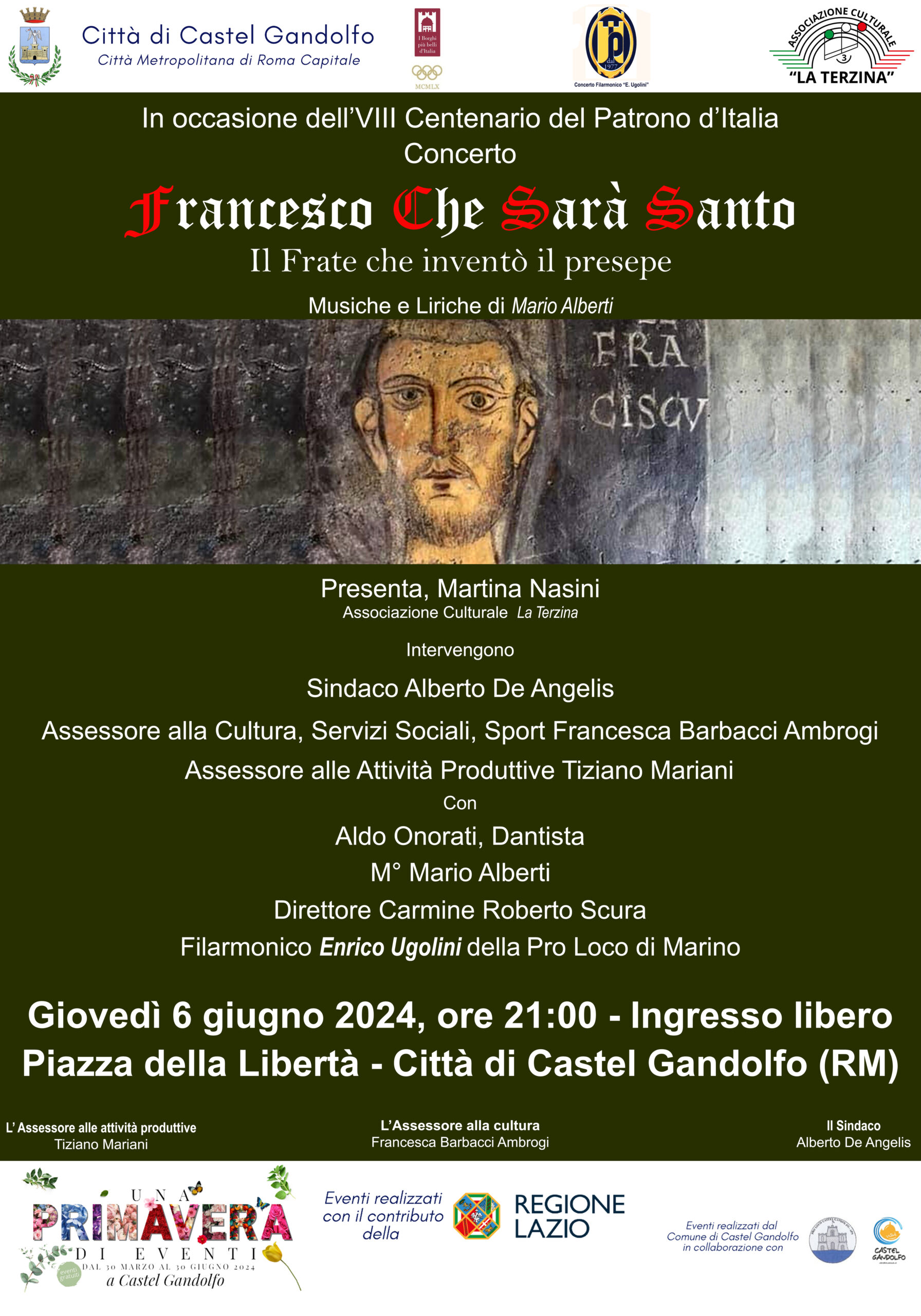 “In questi mesi, grazie al contributo della Regione Lazio, la Città di Castel Gandolfo sta ospitando e ospiterà eventi importanti dal grande spessore culturale, tra cui questa bellissima rappresentazione attraverso cui rivivremo, accompagnati dalle musiche eseguite da artisti talentuosi dei Castelli Romani, la vita di San Francesco, Patrono della nostra Italia e simbolo di rinnovamento spirituale, umiltà e purezza. Ringrazio gli artisti che porteranno in scena quest’opera e l’Associazione La Terzina per la sua realizzazione”, ha dichiarato il Sindaco Alberto De Angelis.