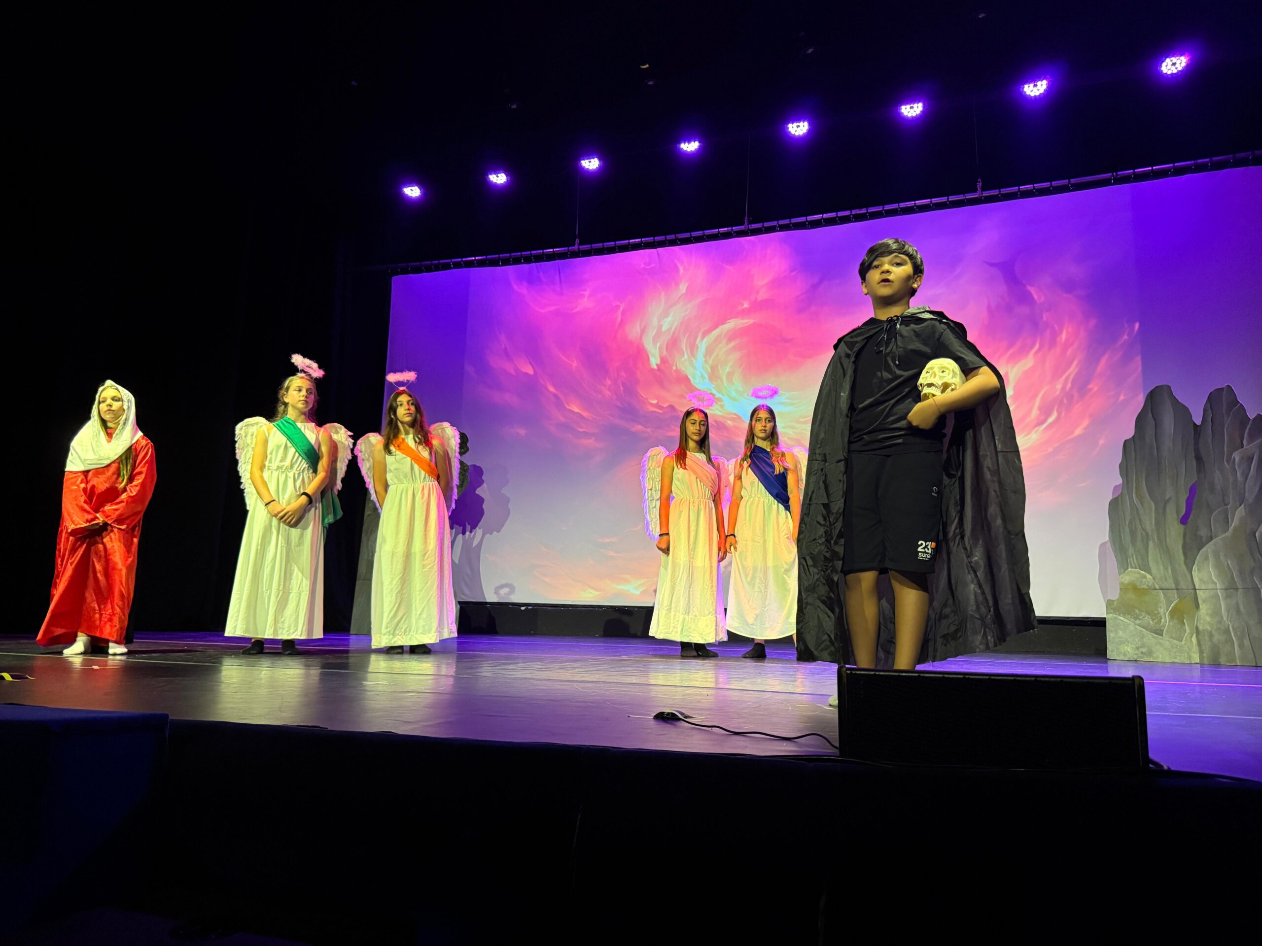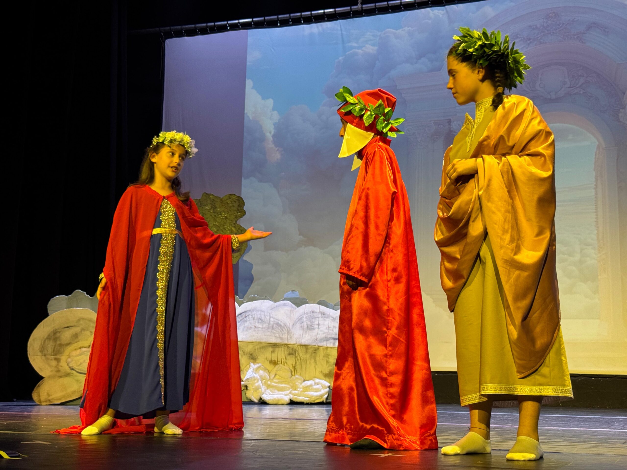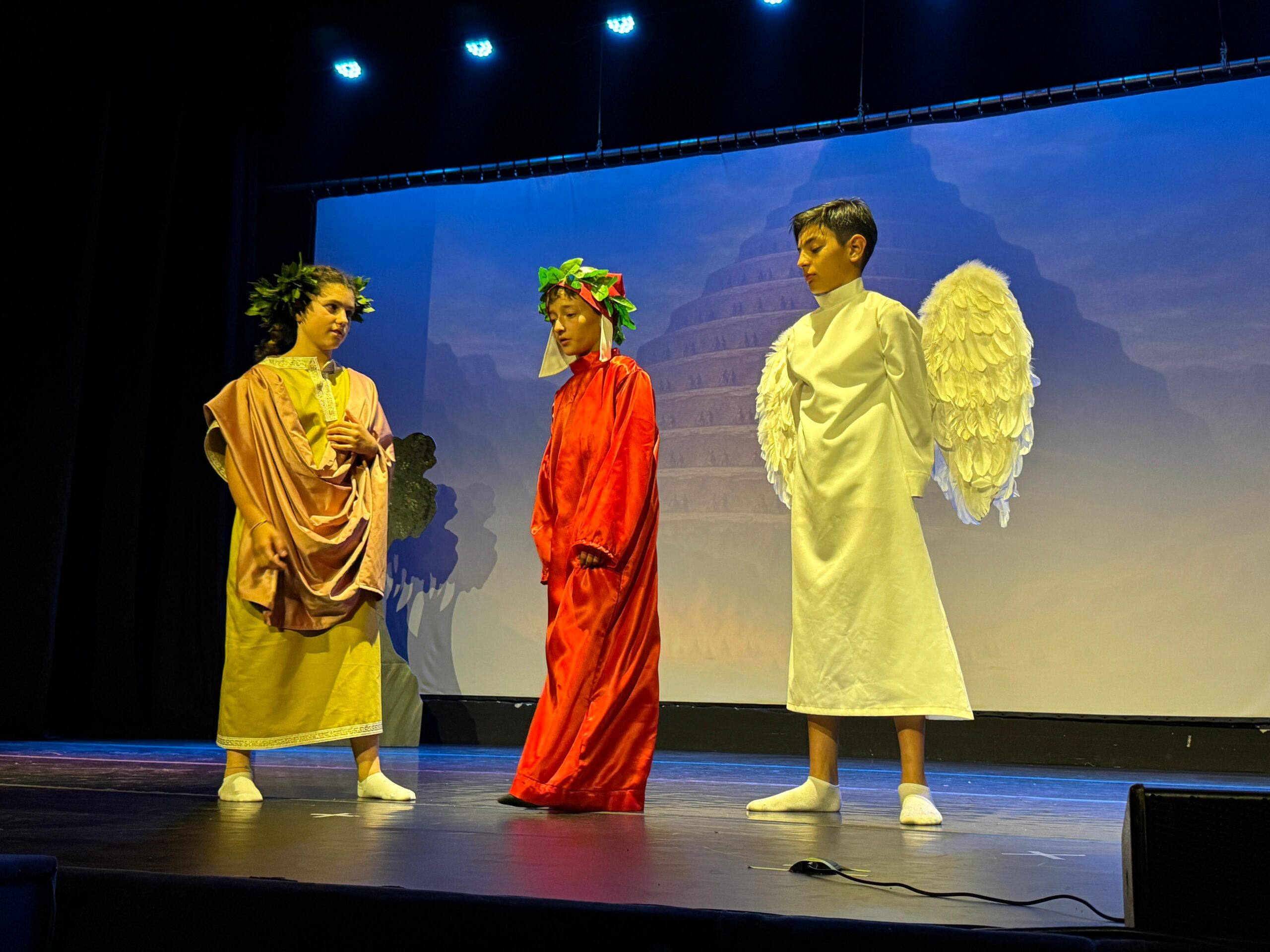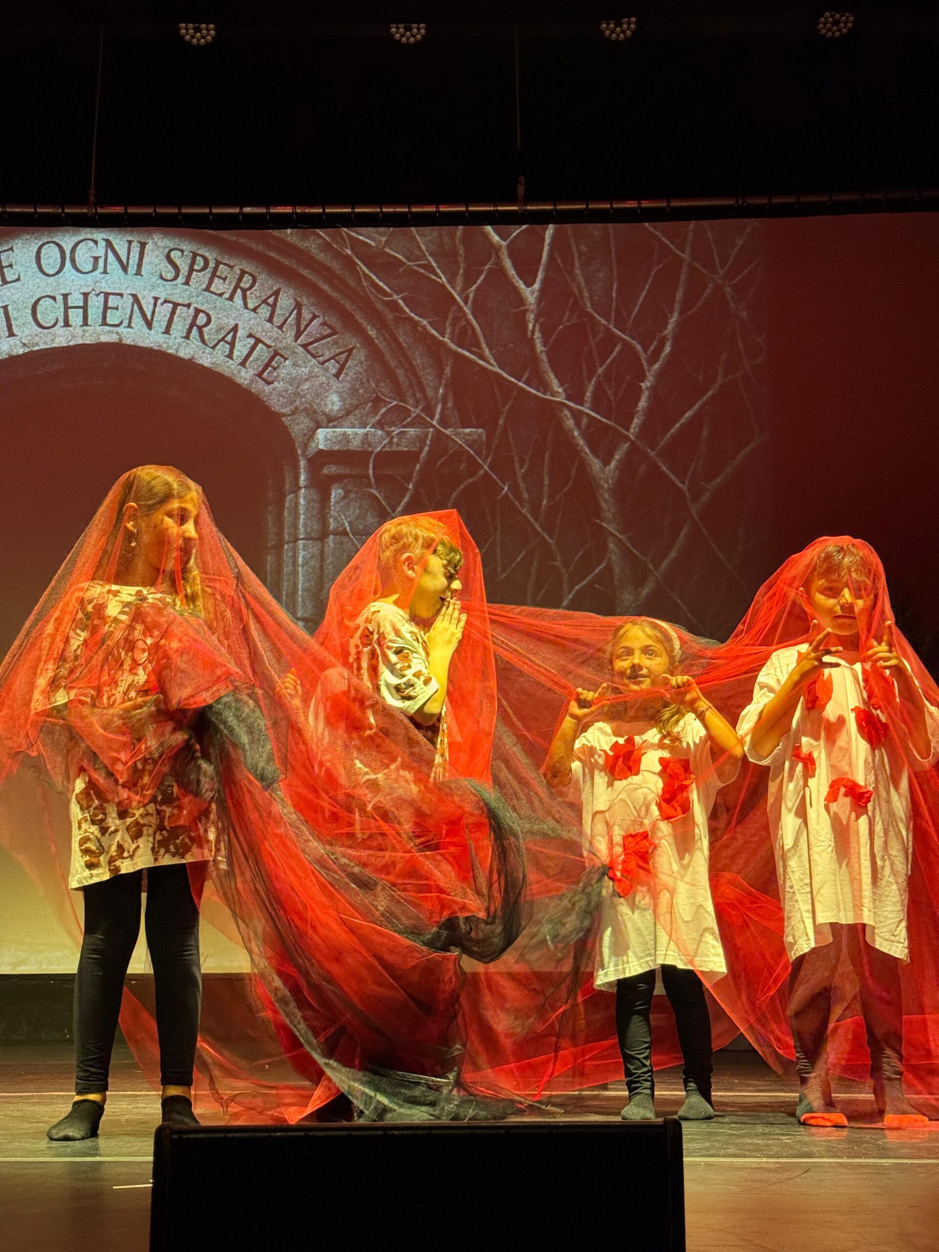 Oltre 85 studenti, provenienti dalla scuola primaria e dalla secondaria di primo grado, hanno preso parte allo spettacolo, dando voce e volto a figure iconiche come Dante, Virgilio, Caronte e le anime del regno ultraterreno, in un percorso teatrale che ha saputo coinvolgere e valorizzare tanto i più piccoli quanto i ragazzi più grandi.