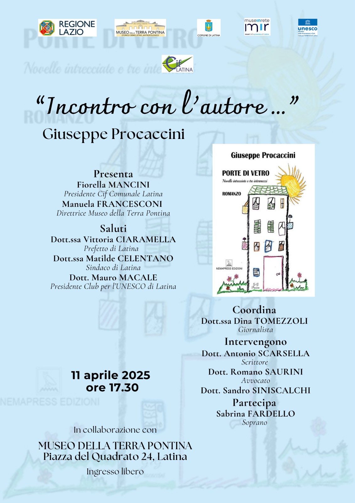 Latina (Lt) – Il Centro Italiano Femminile (CIF) di Latina organizza un nuovo appuntamento con il tradizionale evento “Incontro con l’Autore“. Venerdì 11 aprile, alle ore 17.30, presso il Museo della Terra Pontina, sarà presentato il libro “Porte di Vetro. Novelle intrecciate e tre intermezzi” di Giuseppe Procaccini, insignito del premio della critica al Premio letterario Roma International 2025.