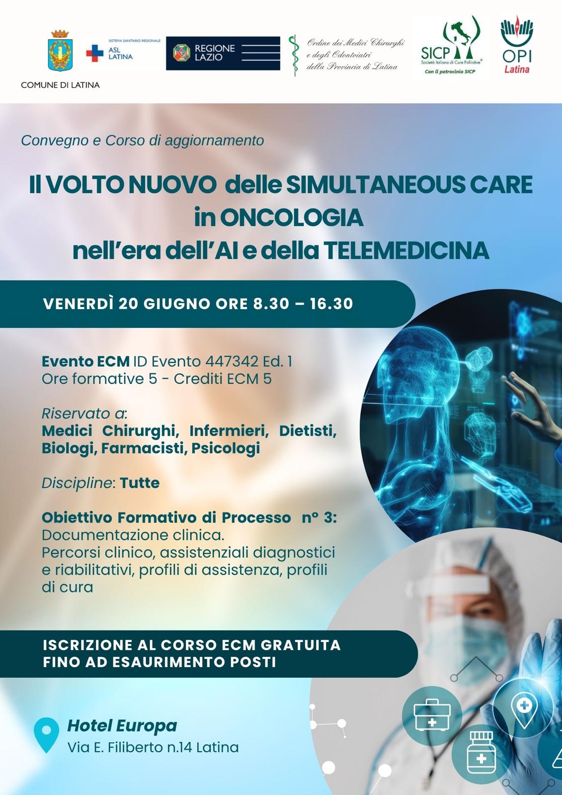 Latina (Lt) – In un momento storico in cui l’oncologia sta vivendo una profonda evoluzione, sia sul piano scientifico che umano, nasce un’importante occasione di confronto e aggiornamento professionale: il convegno Il volto nuovo delle Simultaneous Care in oncologia nell’era dell’Intelligenza Artificiale e della Telemedicina, che si terrà venerdì 20 giugno a Latina, presso l’Hotel Europa.