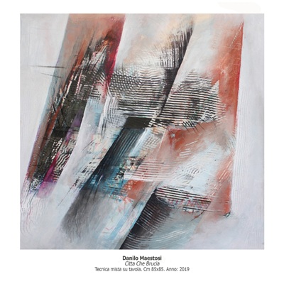 In questa rilevata complessità, infatti, Maestosi costruisce un proprio universo segnico e cromatico, dalla tessitura accurata di Città che brucia (2019), Città che crolla (2019) alla recente La Città e i naufragi (2025).