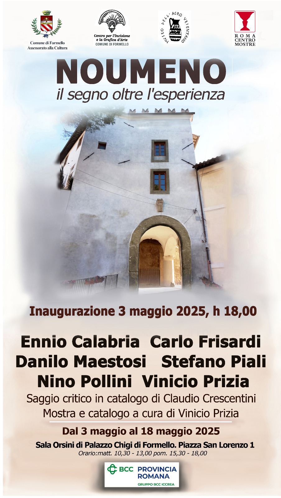 • In mostra opere di ENNIO CALABRIA, CARLO FRISARDI, DANILO MAESTOSI, NINO POLLINI, STEFANO PIALI, VINICIO PRIZIA dal 3 al 18 maggio 2025 presso la Sala Orsini di Palazzo Chigi in Piazza San Lorenzo, 1- Formello. Inaugurazionesabato 3 maggio ore 18:00