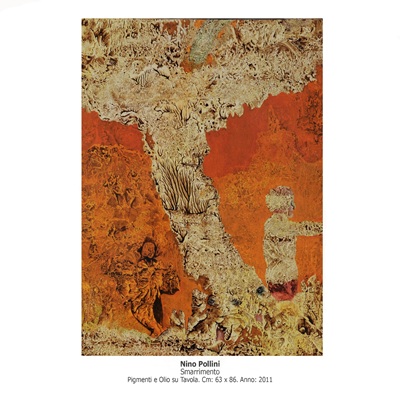 Nella contaminazione fra pensiero e azione, segno e realtà, un caso interessante è quello dell’opera multi-linguistica e iper-moderna di Nino Pollini, un artista la cui drastica connessione col pluralismo dei linguaggi contemporanei supera il concetto stesso di mutamento e contaminazione. Proprio come nelle opere presentate in questa mostra: Smarrimento (2011), l’enigmatica Adamo selfie mentre il suo presente vola (2016), in cui l’artista sperimenta pigmenti e oli senza rinunciare al ragionamento e all’interconnessione, in un certo qual modo contestataria, col presente.