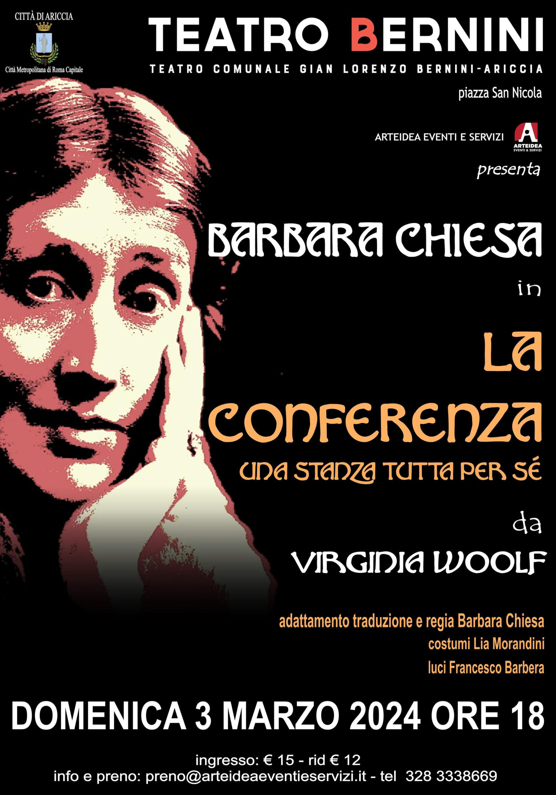 Domenica 3 marzo, alle ore 18, Barbara Chiesa – fresca di partecipazione al film campione d’incassi e di record “C’è ancora domani” di Paola Cortellesi – va in scena con “La conferenza”, spettacolo tratto dalle pagine di Virginia Woolf. “Una stanza tutta per sé” e due conferenze tenute da Virginia Woolf a Cambridge, nell’ottobre del 1928. Come sempre accade per i grandi classici, il tempo non scalfisce in nulla il messaggio, anzi, aggiunge valore e freschezza alle idee. Il testo si snoda attraverso associazioni logico-intuitive a cercare risposte oggettive e storiche al problema dell’esclusione del genere femminile dalla vita artistica e letteraria dall’inizio dei tempi. Una sorta di flusso di coscienza, che si sostituisce all’azione drammatica e ci porta nella sofferta mente di una donna geniale. L’adattamento, la traduzione e la regia sono di Barbara Chiesa, le luci di Francesco Barbera e i costumi di Lia Morandini.