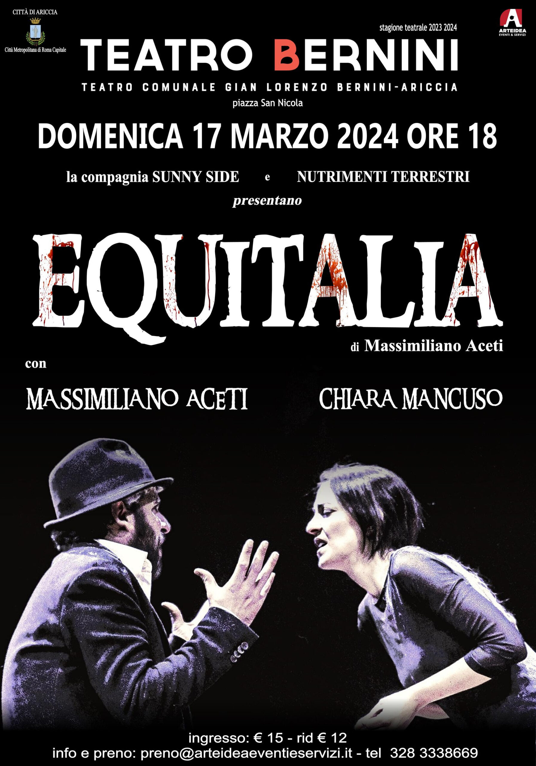 Domenica 17 marzo, sempre alle 18, saliranno sul palco ariccino Massimiliano Aceti e Chiara Mancuso con “Equitalia”. La storia è quella di Mario ed Elsa sono marito e moglie da quarant’anni e dopo una vita di sacrifici e lavoro, si vedono portare via il loro ristorante a causa dei debiti. All’umiliazione di essere rimasti senza luce e senza acqua, si aggiunge anche quella di scoprire che il ristorante è stato messo all’asta per un debito di 4.500 euro. I due si rendono conto di non avere più nulla da perdere e decidono di compiere un gesto rivoluzionario: far saltare la sede di Equitalia a Roma. Mario ed Elsa non hanno intenzione di fare del male a nessuno e studiano un piano per bruciare l’edificio durante la notte. Questa nuova avventura fa rinascere la passione tra i due che, dopo anni di routine e silenzi, scoprono di amarsi come il primo giorno in cui si sono incontrati. Ovviamente però, Mario ed Elsa non sono due terroristi e non hanno il sangue freddo dei criminali. Arrivati davanti alla sede di Equitalia con le loro ‘bombe fatte in casa’ realizzano, con loro profondo dispiacere, di non aver portato l’accendino per innescare gli ordigni. Tornano a casa sconfitti ma la loro rabbia ormai non può fermarsi. Riusciranno a far sentire la loro voce contro l’ingiustizia dello Stato italiano? Il testo ha vinto il Premio “Miglior Testo” al Festival Indivenire 2019, il Premio “Miglior Drammaturgia” Velletrama 2021 ed è stato Finalista a Intransito 2021. La produzione è a cura di Nutrimenti Terrestri e Sunny Side.