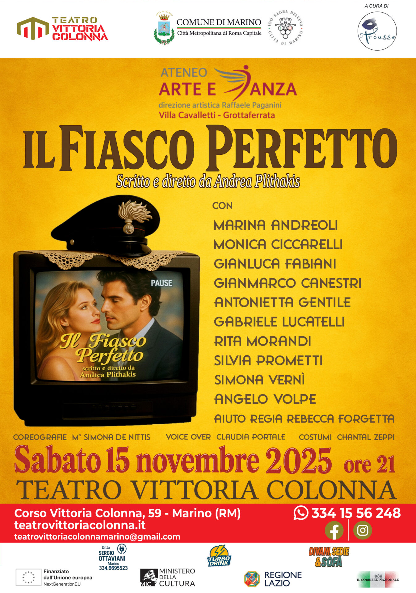 - Sabato 15 novembre 2025 alle ore 21,00 si terrà presso il Teatro V. Colonna di Marino lo spettacolo dedicato al grande teatro del territorio: “Il Fiasco perfetto” di Andrea Plithakis, una commedia brillante e irresistibilmente umana
