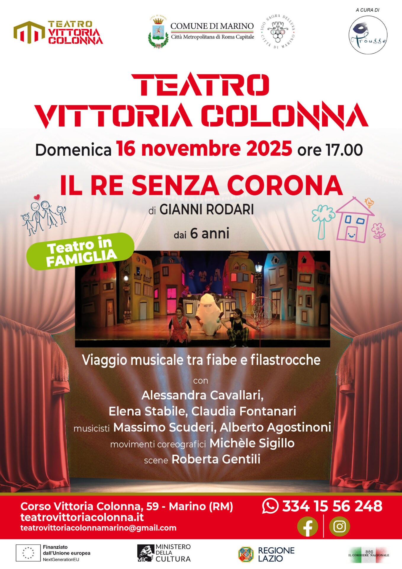 Mentre Domenica 16 novembre 2025 alle ore 17,00 andrà in scena “Il Re senza corona” di Gianni Rodari, Viaggio musicale tra fiabe e filastrocche di Gianni Rodari con Alessandra Cavallari, Elena Stabile e Claudia Fontanari; musicisti Massimo Scuderi e Alberto Agostinoni; movimenti coreografici Michèle Sigillo; scene Roberta Gentili.