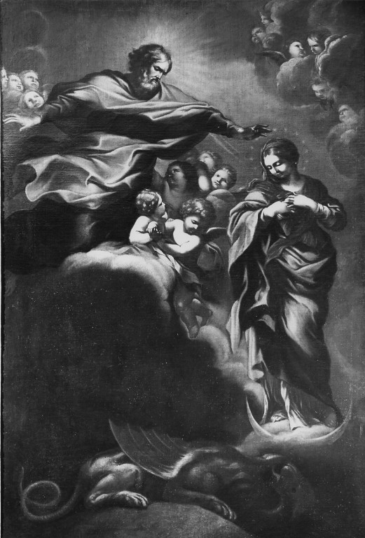Ai piedi della Madonna compare il serpente simbolo del male che la Madonna calpesta vincendolo. Maria è vestita con una tunica bianca simbolo della sua purezza e della sua nascita senza peccato ha un manto azzurro come il cielo, sul capo una corona di stelle. Solitamente il ventre è leggermente gonfio perché Maria è incita dell’ Apocalisse. In questo caso l’impianto dell’opera sembra ancora accademico l’impianto statico senza movimento ad eccezione del manto della Madonna.