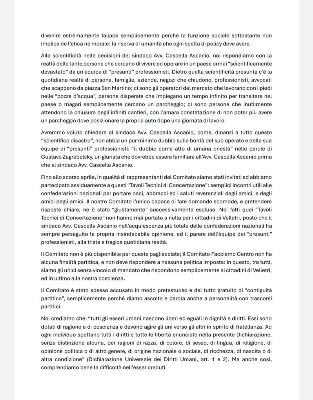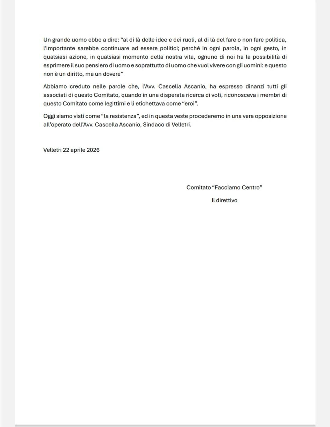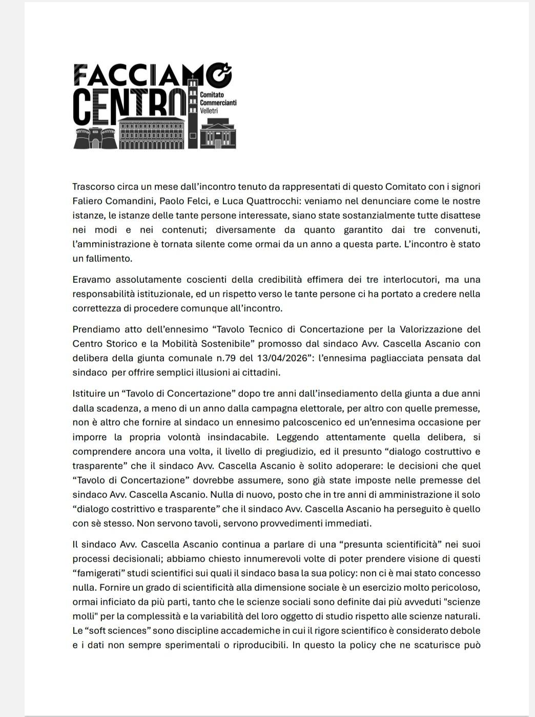 Velletri 23 aprile 2026 – Si fa sempre più acceso il confronto tra il Comitato “Facciamo Centro” e l’amministrazione comunale guidata dal sindaco Cascella. Dopo settimane di silenzio istituzionale, il duro comunicato diffuso nelle scorse ore dal Comitato segna un punto di rottura politica e civile che potrebbe aprire una nuova fase nel dibattito sul futuro del centro storico veliterno.