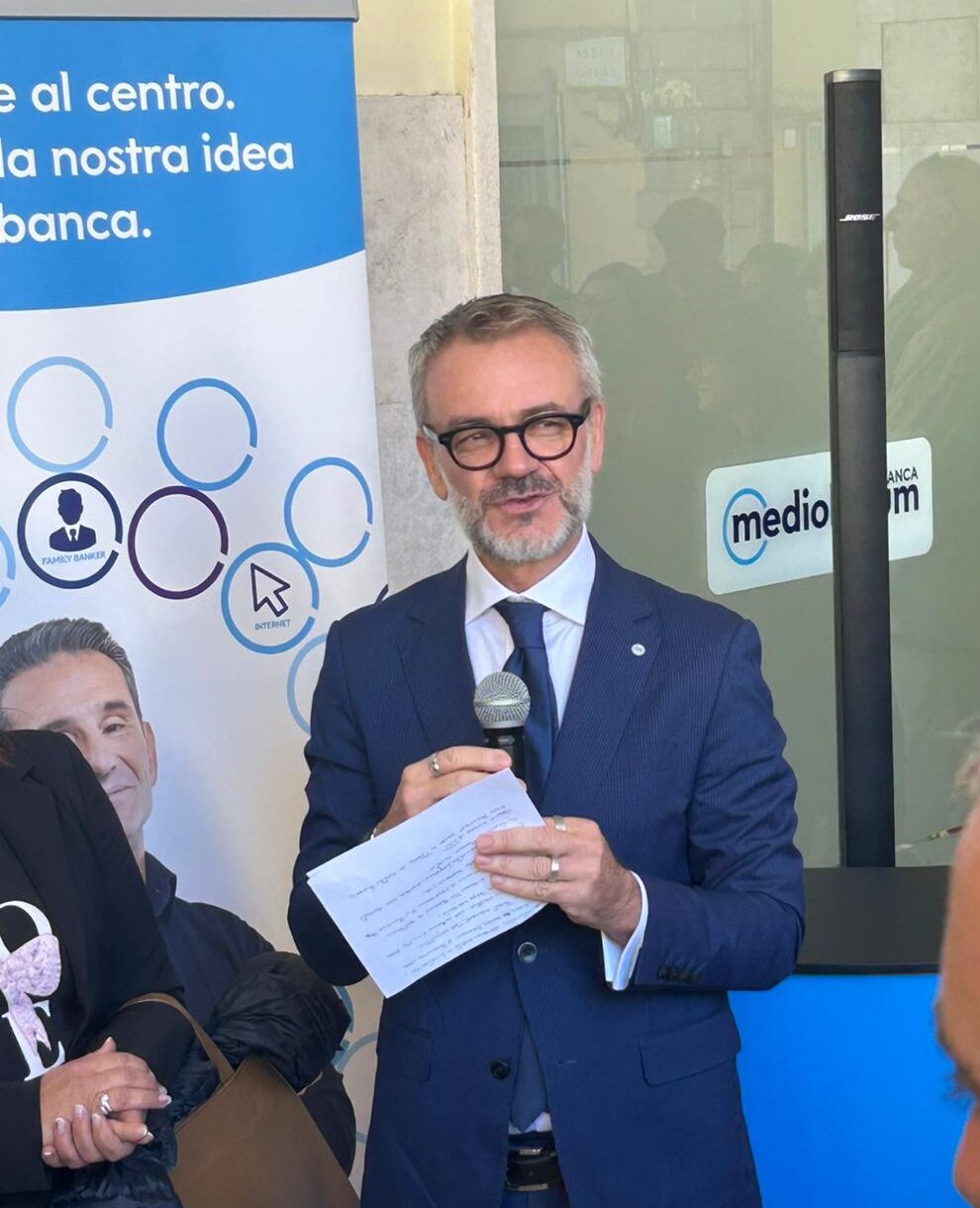È poi intervenuto il Responsabile del centro-sud dell’Istituto bancario, il Network Regional Manager, Costante Turchi che, prima della benedizione ufficiale, ha rinnovato i ringraziamenti: “Il primo ringraziamento lo volgo ai nostri clienti che ci danno fiducia da tanti anni, questa è un’iniziativa concreta per essere al vostro fianco. Ringrazio inoltre i nostri 14 colleghi, per una banca fatta non solo da dipendenti e clienti ma da persone vere. Possono esserci avversità, ma noi ci siamo sempre. Oggi è un giorno di festa in questa bellissima piazza.”