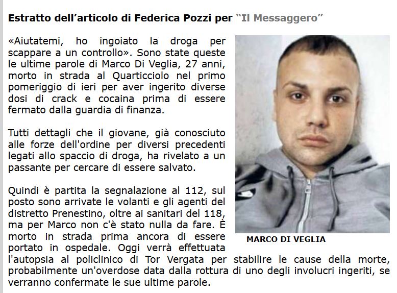 Roma (Rm) – Un uomo di 27 anni, Marco Di Veglia, è morto dopo aver ingoiato alcune dosi di droga per sfuggire ad un controllo. (Una mossa che spesso utilizzano i corrieri della droga impegnati nello spaccio internazionale per poi riespellere le dosi ingerite)