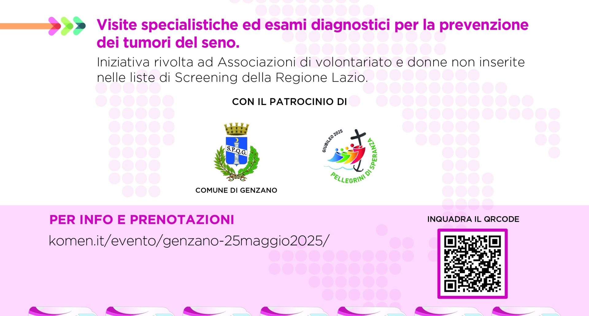 Genzano (Rm) – Si potranno eseguire gratuitamente, previo appuntamento sul sito, indicato sulla locandina, esami diagnostici per la prevenzione dei tumori al seno: