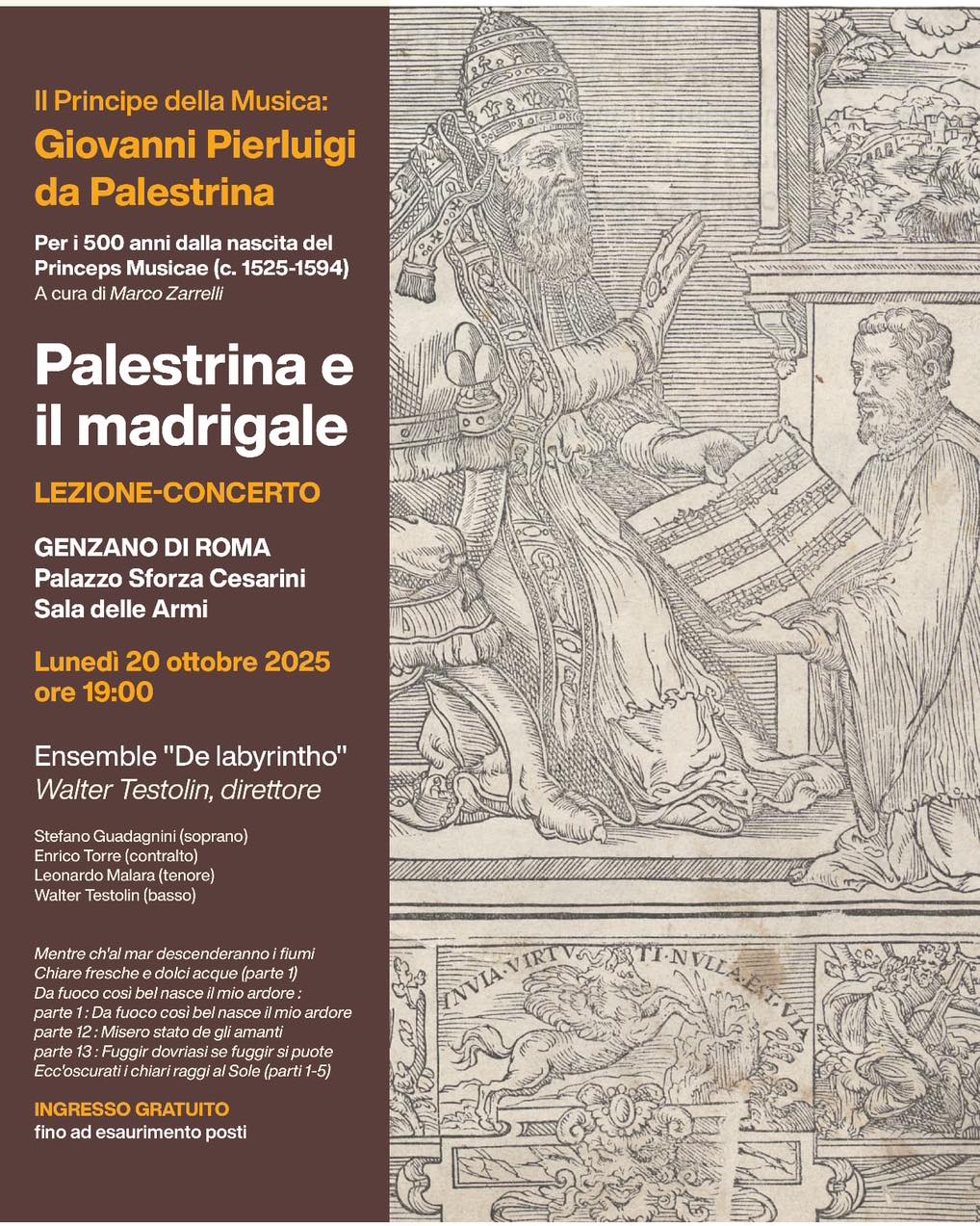 Genzano 20 ottobre 2025 – Oggi, lunedì 20 ottobre alle ore 19:00, la suggestiva Sala delle Armi di Palazzo Sforza Cesarini sarà teatro di una serata unica, interamente focalizzata sul genere del madrigale cinquecentesco.