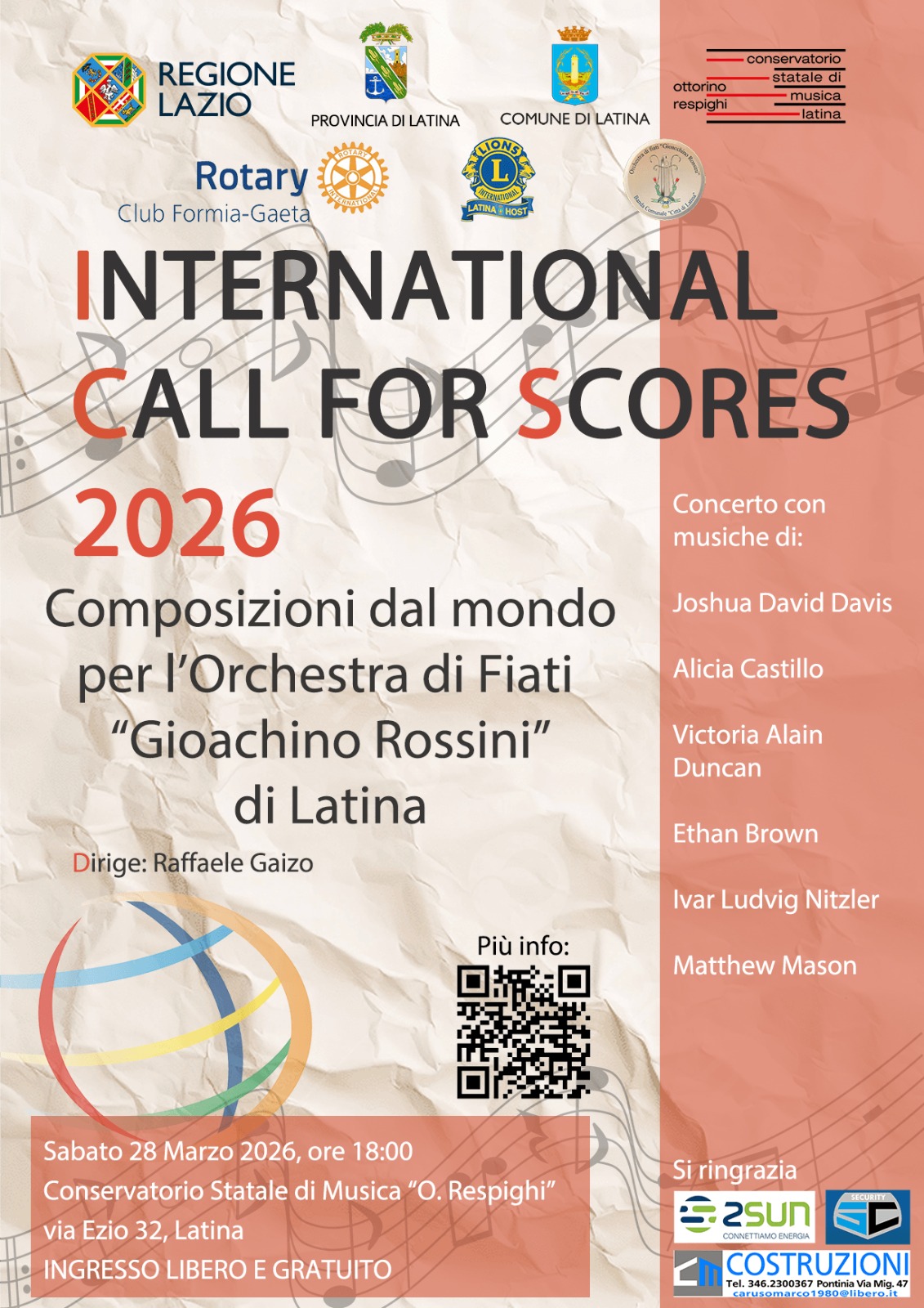 Sabato 28 marzo alle ore 18.00 l’Auditorium del Conservatorio “O. Respighi” di Latina ospiterà il concerto con le composizioni selezionate dal Call for Scores promosso dall’Associazione “G. Rossini” di Latina, un progetto pensato per scoprire e valorizzare nuove pagine dedicate all’organico bandistico.