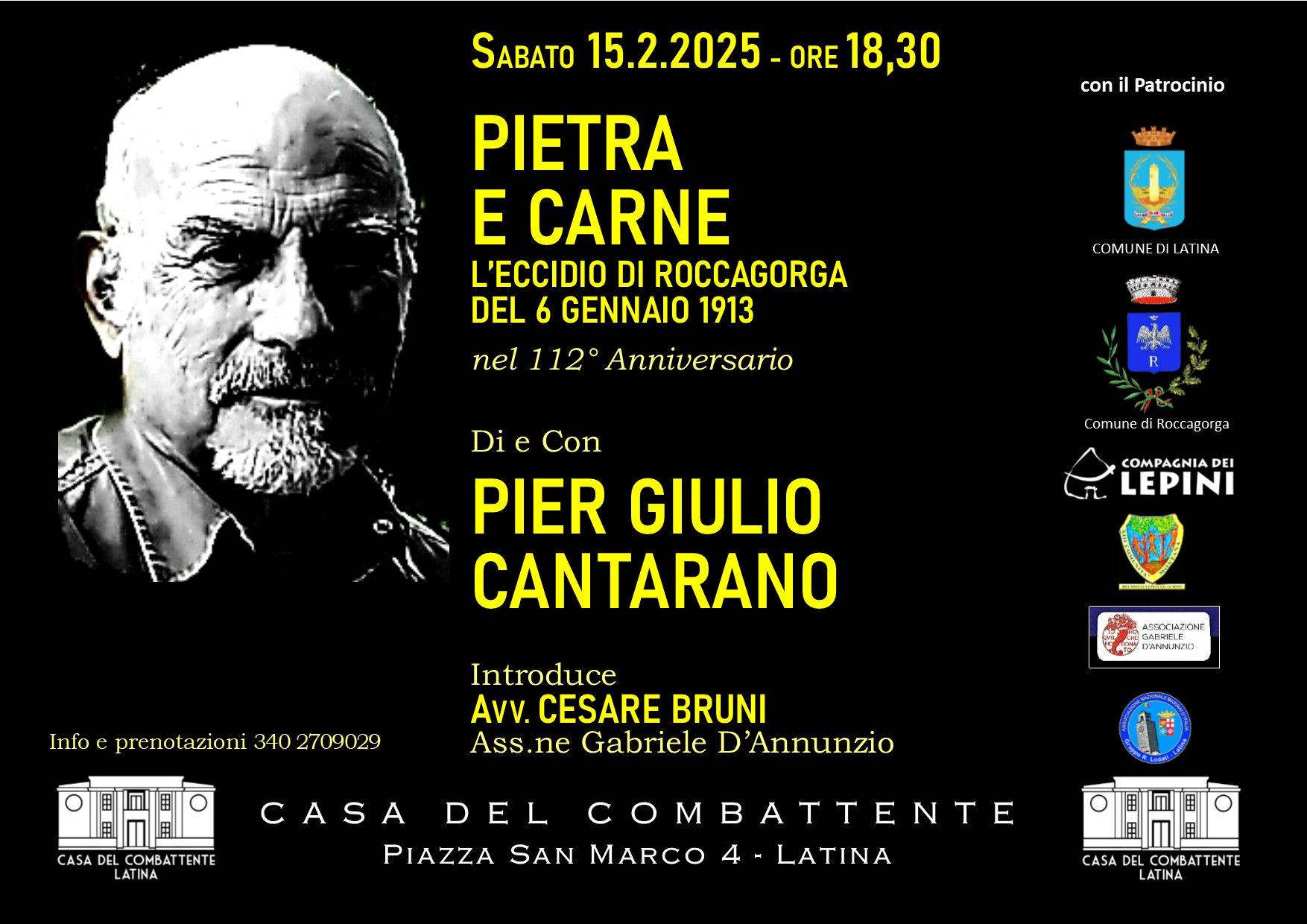 Latina (Lt) – Andrà in scena sabato 15 febbraio alle ore 18.30 alla Casa del Combattente di Latina, la pièce teatrale “Pietra e Carne” l’eccidio di Roccagorga del 6 gennaio del 1913 nel 112° anniversario, di e con Pier Giulio Cantarano architetto, attore, scrittore, storico e cultore delle tradizioni del territorio.
